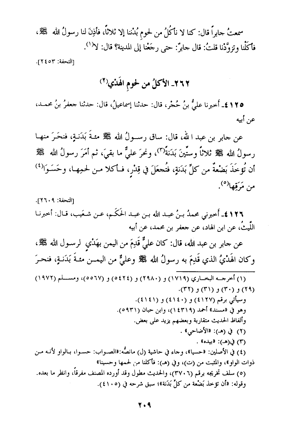 4125 - أَخْبَرَنَا عَلِيُّ بْنُ حُجْرٍ، قَالَ: حَدَّثَنَا إِسْمَاعِيلُ، قَالَ: حَدَّثَنَا جَعْفَرُ بْنُ مُحَمَّدٍ، عَنْ أَبِيهِ، عَنْ جَابِرِ بْنِ عَبْدِ اللهِ، قَالَ: سَاقَ رَسُولُ اللهِ صَلَّى اللهُ عَلَيْهِ وَسَلَّمَ مِائَةَ بَدَنَةٍ فَنَحَرَ مِنْهَا رَسُولُ اللهِ صَلَّى اللهُ عَلَيْهِ وَسَلَّمَ ثَلَاثًا وَسِتِّينَ بَدَنَةً وَنَحَرَ عَلِيٌّ مَا بَقِيَ، ثُمَّ أَمَرَ رَسُولُ اللهِ صَلَّى اللهُ عَلَيْهِ وَسَلَّمَ «§أَنْ تُؤْخَذَ بَضْعَةٌ مِنْ كُلِّ بَدَنَةٍ فَتُجْعَلُ فِي قِدْرٍ فَأَكَلَا مِنْ لَحْمِهَا وَحَسَوَا مِنْ مَرَقِهَا»