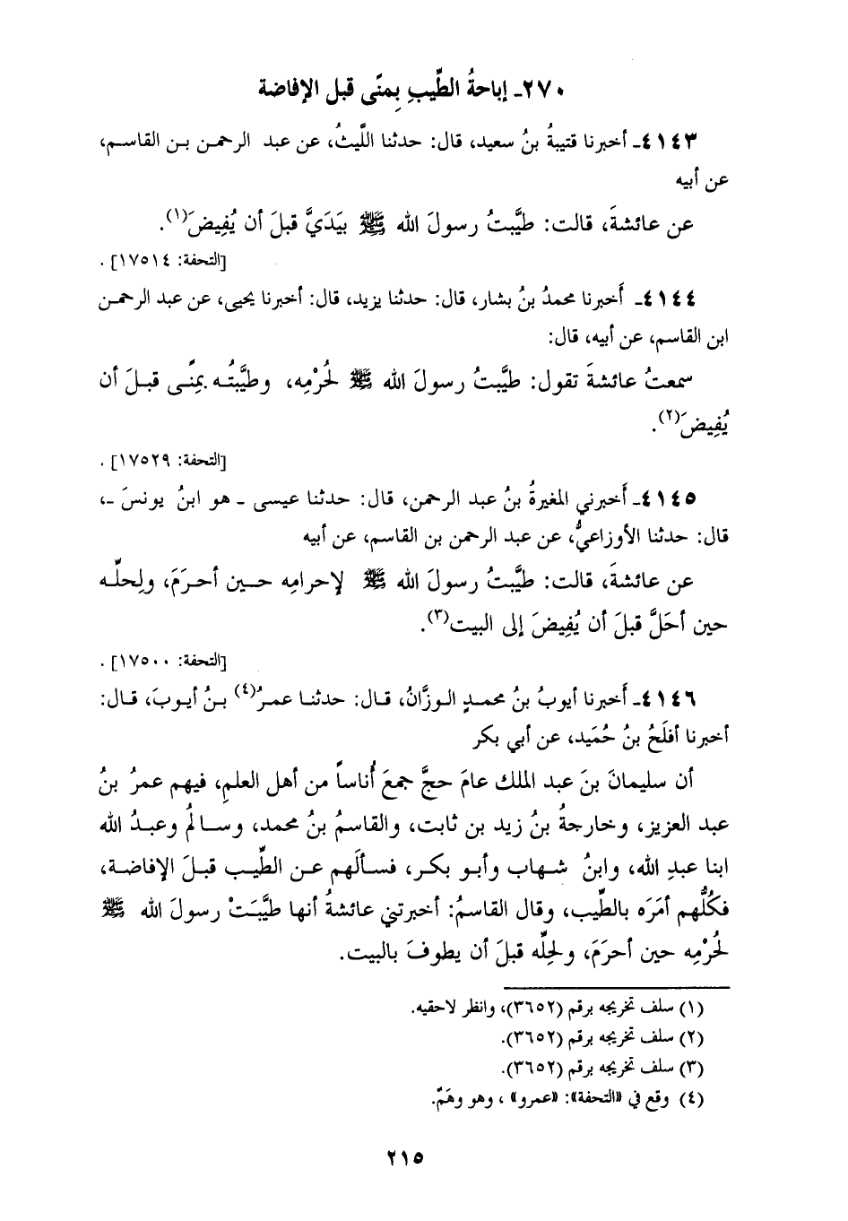 4143 - أَخْبَرَنَا قُتَيْبَةُ بْنُ سَعِيدٍ، قَالَ: حَدَّثَنَا اللَّيْثُ، عَنْ عَبْدِ الرَّحْمَنِ بْنِ الْقَاسِمِ، عَنْ أَبِيهِ، عَنْ عَائِشَةَ، قَالَتْ: «§طَيَّبْتُ رَسُولَ اللهِ صَلَّى اللهُ عَلَيْهِ وَسَلَّمَ بِيَدِي قَبْلَ أَنْ يُفِيضَ»
