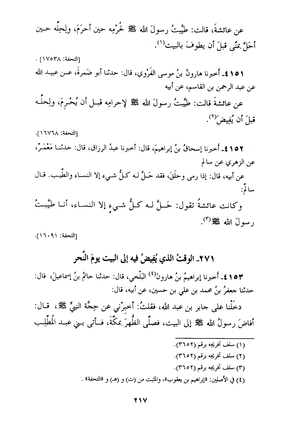 4151 - أَخْبَرَنَا هَارُونُ بْنُ مُوسَى الْفَرَوِيُّ، قَالَ: حَدَّثَنَا أَبُو ضَمْرَةَ، عَنْ عُبَيْدِ اللهِ، عَنْ عَبْدِ الرَّحْمَنِ بْنِ الْقَاسِمِ، عَنْ أَبِيهِ، عَنْ عَائِشَةَ، قَالَتْ: «§طَيَّبْتُ رَسُولَ اللهِ صَلَّى اللهُ عَلَيْهِ وَسَلَّمَ لِإِحْرَامِهِ قَبْلَ أَنْ يُحْرِمَ وَلِحِلِّهِ قَبْلَ أَنْ يُفِيضَ»