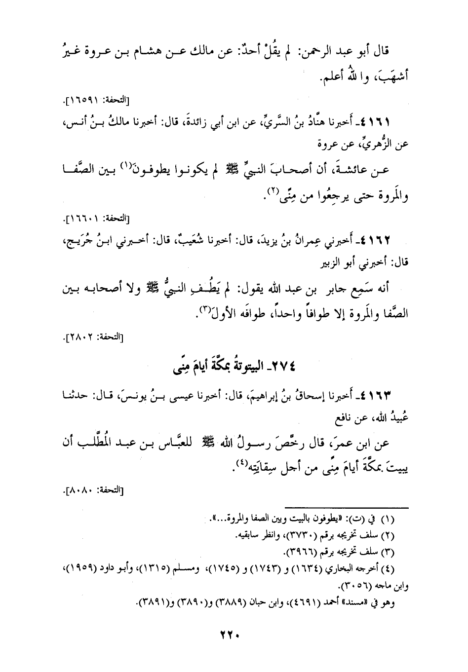 4161 - أَخْبَرَنَا هَنَّادُ بْنُ السَّرِيِّ، عَنِ ابْنِ أَبِي زَائِدَةَ، قَالَ: أَخْبَرَنَا مَالِكُ بْنُ أَنَسٍ، عَنِ الزُّهْرِيِّ، عَنْ عُرْوَةَ، عَنْ عَائِشَةَ، أَنَّ أَصْحَابَ النَّبِيِّ صَلَّى اللهُ عَلَيْهِ وَسَلَّمَ «§لَمْ يَكُونُوا يَطُوفُونَ بَيْنَ الصَّفَا وَالْمَرْوَةِ حَتَّى رَجَعُوا مِنْ مِنًى»