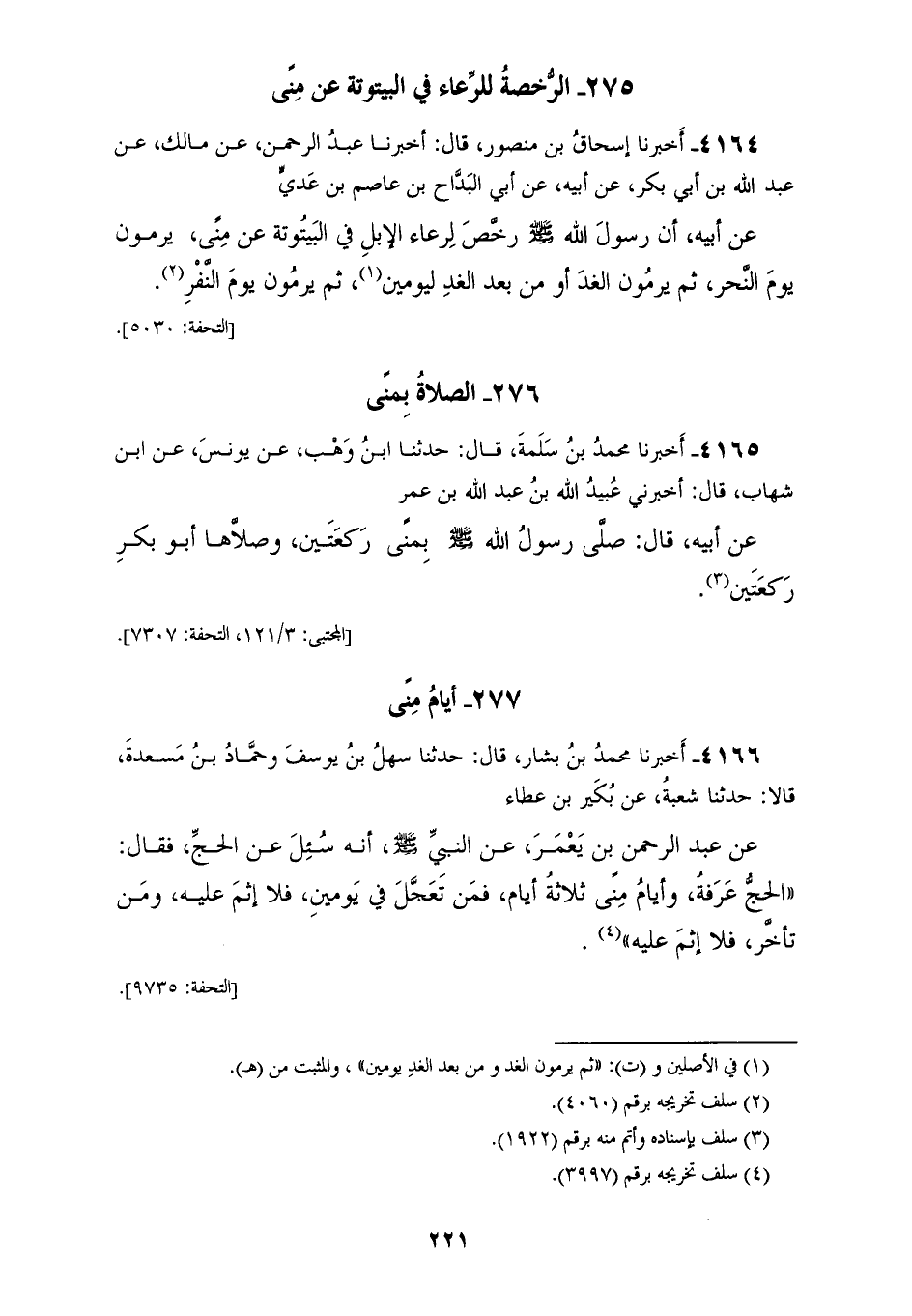 4164 - أَخْبَرَنَا إِسْحَاقُ بْنُ مَنْصُورٍ، قَالَ: أَخْبَرَنَا عَبْدُ الرَّحْمَنِ، عَنْ مَالِكٍ، عَنْ عَبْدِ اللهِ بْنِ أَبِي بَكْرٍ، عَنْ أَبِيهِ، عَنْ أَبِي الْبَدَّاحِ بْنِ عَاصِمِ بْنِ عَدِيٍّ، عَنْ أَبِيهِ، أَنَّ رَسُولَ اللهِ صَلَّى اللهُ عَلَيْهِ وَسَلَّمَ «§رَخَّصَ لِرِعَاءِ الْإِبِلِ فِي الْبَيْتُوتَةِ عَنْ مِنًى يَرْمُونَ يَوْمَ النَّحْرِ، ثُمَّ يَرْمُونَ الْغَدَ أَوْ مِنْ بَعْدِ الْغَدِ لِيَوْمَيْنِ، ثُمَّ يَرْمُونَ يَوْمَ النَّفْرِ»