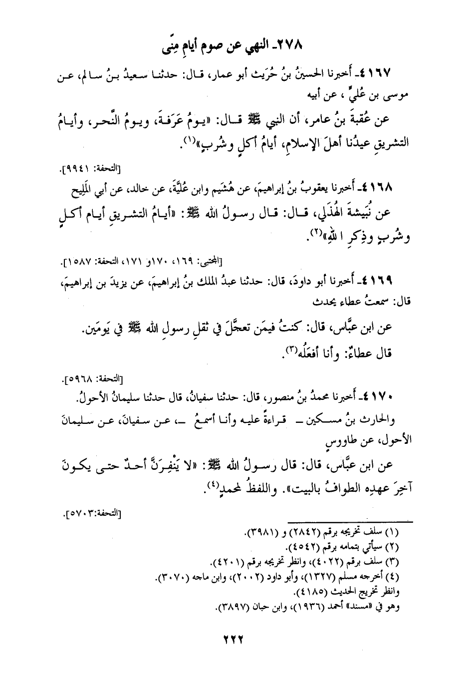 4170 - أَخْبَرَنَا مُحَمَّدُ بْنُ مَنْصُورٍ، قَالَ: حَدَّثَنَا سُفْيَانُ، قَالَ: حَدَّثَنَا سُلَيْمَانُ الْأَحْوَلُ، وَالْحَارِثُ بْنُ مِسْكِينٍ، قِرَاءَةً عَلَيْهِ وَأَنَا أَسْمَعُ، عَنْ سُفْيَانَ، عَنْ سُلَيْمَانَ الْأَحْوَلَ، عَنْ طَاوُسٍ، عَنِ ابْنِ عَبَّاسٍ، قَالَ: قَالَ رَسُولُ اللهِ صَلَّى اللهُ عَلَيْهِ وَسَلَّمَ: «§لَا يَنْفِرَنَّ أَحَدٌ حَتَّى يَكُونَ آخِرَ عَهْدِهِ الطَّوَافُ بِالْبَيْتِ» وَاللَّفْظُ لِمُحَمَّدٍ