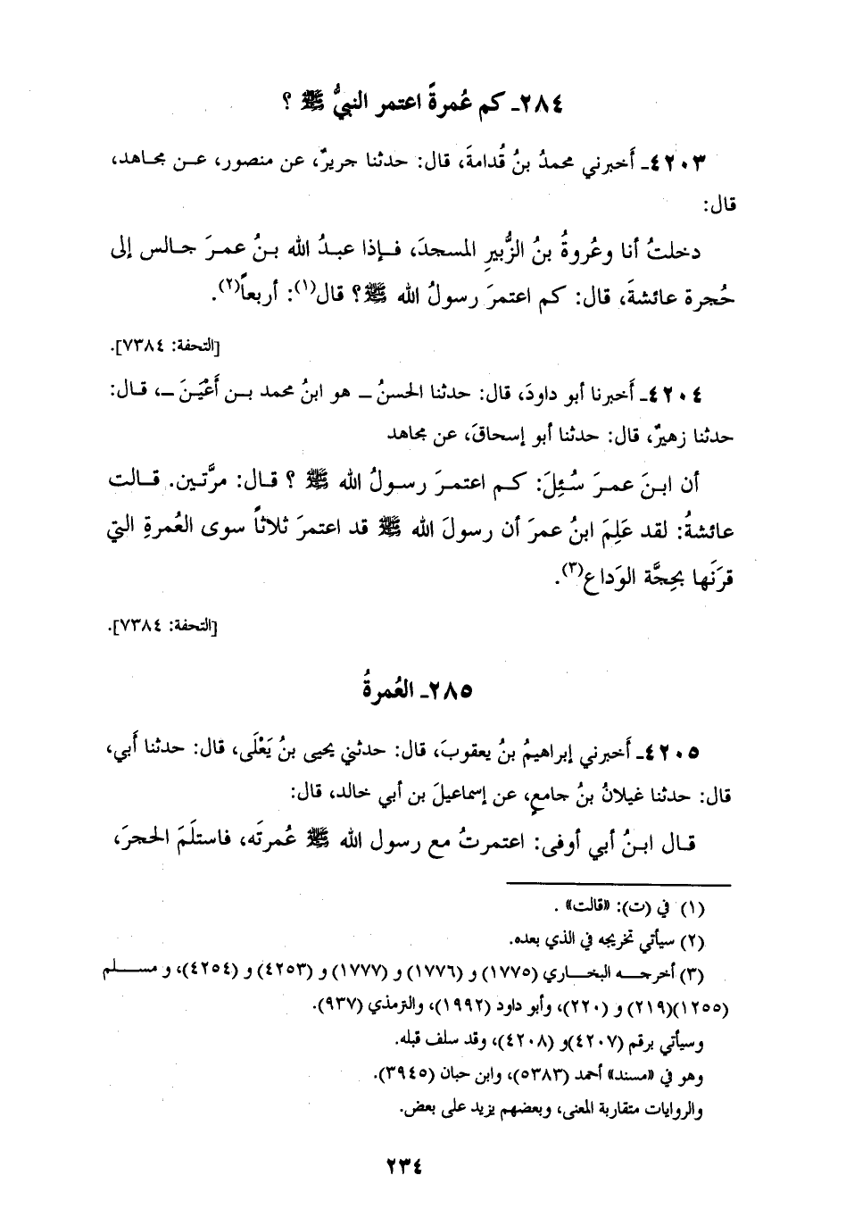 4203 - أَخْبَرَنِي مُحَمَّدُ بْنُ قُدَامَةَ، قَالَ: حَدَّثَنَا جَرِيرٌ، عَنْ مَنْصُورٍ، عَنْ مُجَاهِدٍ، قَالَ: دَخَلْتُ أَنَا وَعُرْوَةُ بْنُ الزُّبَيْرِ الْمَسْجِدَ، فَإِذَا عَبْدُ اللهِ بْنُ عُمَرَ جَالِسٌ إِلَى حُجْرَةِ عَائِشَةَ، قَالَ: كَمِ اعْتَمَرَ رَسُولُ اللهِ صَلَّى اللهُ عَلَيْهِ وَسَلَّمَ قَالَتْ: «§أَرْبَعًا»