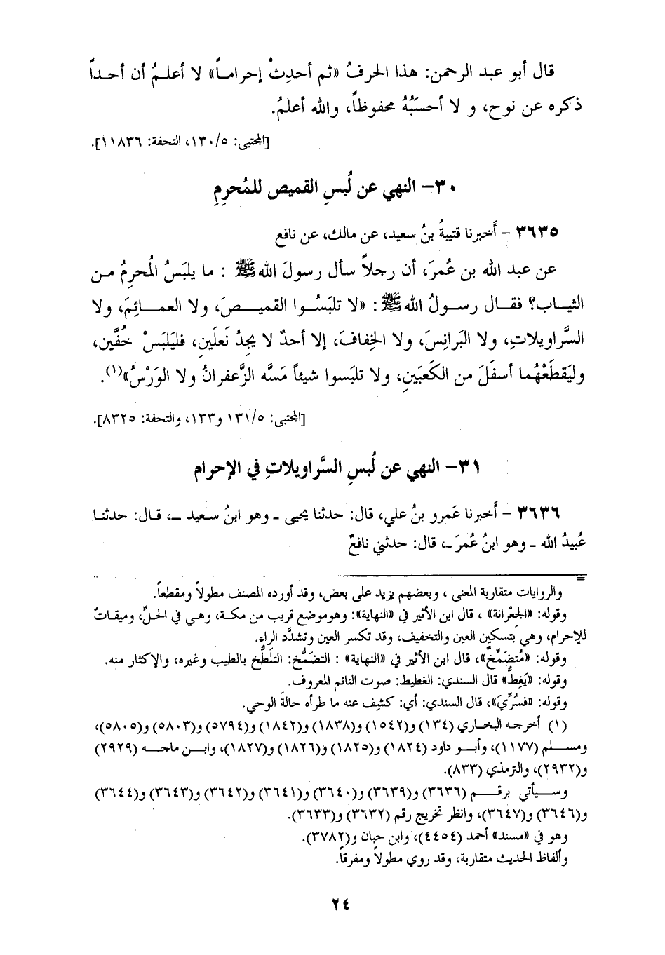 3635 - أَخْبَرَنَا قُتَيْبَةُ بْنُ سَعِيدٍ، عَنْ مَالِكٍ، عَنْ نَافِعٍ، عَنْ عَبْدِ اللهِ بْنِ عُمَرَ، أَنَّ رَجُلًا سَأَلَ رَسُولَ اللهِ صَلَّى اللهُ عَلَيْهِ وَسَلَّمَ مَا يَلْبَسُ الْمُحْرِمُ مِنَ الثِّيَابِ؟ فَقَالَ رَسُولُ اللهِ صَلَّى اللهُ عَلَيْهِ وَسَلَّمَ: «§لَا تَلْبَسُوا الْقَمِيصَ، وَلَا الْعَمَائِمَ وَلَا السَّرَاوِيلَاتِ، وَلَا الْبَرَانِسَ، وَلَا الْخِفَافَ، إِلَّا أَحَدٌ لَا يَجِدُ نَعْلَيْنِ فَلْيَلْبَسْ خُفَّيْنِ، وَلْيَقْطَعْهُمَا أَسْفَلَ مِنَ الْكَعْبَيْنِ، وَلَا تَلْبَسُوا شَيْئًا مَسَّهُ الزَّعْفَرَانُ وَلَا الْوَرْسُ»