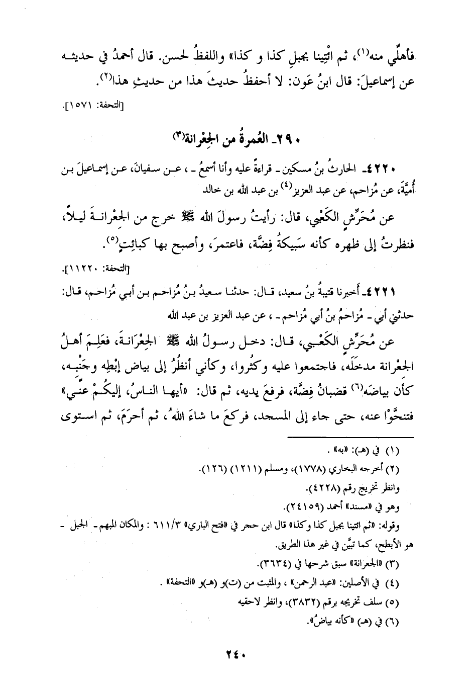 4220 - الْحَارِثُ بْنُ مِسْكِينٍ قِرَاءَةً عَلَيْهِ وَأَنَا أَسْمَعُ، عَنْ سُفْيَانَ، عَنْ إِسْمَاعِيلَ بْنِ أُمَيَّةَ، عَنْ مُزَاحِمٍ، عَنْ عَبْدِ الْعَزِيزِ بْنِ عَبْدِ اللهِ بْنِ خَالِدٍ، عَنْ مُحَرِّشٍ الْكَعْبِيِّ، قَالَ: رَأَيْتُ رَسُولَ اللهِ صَلَّى اللهُ عَلَيْهِ وَسَلَّمَ «§خَرَجَ مِنَ الْجِعِرَّانَةِ لَيْلًا فَنَظَرْتُ إِلَى ظَهْرِهِ كَأَنَّهُ سَبِيكَةُ فِضَّةٍ فَاعْتَمَرَ وَأَصْبَحَ بِهَا كَبَائِتٍ»