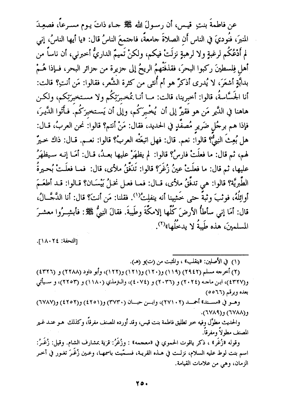 4244 - أَخْبَرَنَا مُحَمَّدُ بْنُ الْمُثَنَّى، عَنِ الْحَجَّاجُ، قَالَ: حَدَّثَنَا حَمَّادٌ، قَالَ: أَخْبَرَنَا دَاوُدُ بْنُ أَبِي هِنْدٍ، عَنِ الشَّعْبِيِّ، عَنْ فَاطِمَةَ بِنْتِ قَيْسٍ، أَنَّ رَسُولَ اللهِ صَلَّى اللهُ عَلَيْهِ وَسَلَّمَ جَاءَ ذَاتَ يَوْمٍ مُسْرِعًا فَصَعِدَ الْمِنْبَرَ فَنُودِيَ فِي النَّاسِ أَنَّ الصَّلَاةَ جَامِعَةٌ فَاجْتَمَعَ النَّاسُ، قَالَ: " يَا أَيُّهَا النَّاسُ إِنِّي لَمْ أَدْعُكُمْ لِرَغْبَةٍ وَلَا لِرَهْبَةٍ نَزَلَتْ فِيكُمْ، وَلَكِنَّ تَمِيمًا الدَّارِيَّ أَخْبَرَنِي أَنَّ نَاسًا مِنْ أَهْلِ فِلَسْطِينَ رَكِبُوا الْبَحْرَ فَقَذَفَتْهُمُ الرِّيحُ إِلَى جَزِيرَةٍ مِنْ جَزَائِرِ الْبَحْرِ، فَإِذَا هُمْ بِدَابَّةٍ أَشْعَرَ لَا يُدْرَى أَذَكَرٌ هُوَ أَمْ أُنْثَى؟ مِنْ كَثْرَةِ الشَّعْرِ، فَقَالُوا: مَنْ أَنْتَ؟ قَالَتْ: أَنَا الْجَسَّاسَةُ، قَالُوا: أَخْبِرِينَا، قَالَتْ: مَا أَنَا بِمُخْبِرَتِكُمْ وَلَا مُسْتَخْبِرَتِكُمْ وَلَكِنْ هَاهُنَا فِي الدَّيْرِ مَنْ هُوَ فَقِيرٌ إِلَى أَنْ يُخْبِرَكُمْ وَإِلَى أَنْ يَسْتَخْبِرَكُمْ، فَأَتَوَا الدَّيْرَ فَإِذَا هُمْ بِرَجُلٍ ضَرِيرٍ مُصَفَّدٍ فِي الْحَدِيدِ، فَقَالَ: مَنْ أَنْتُمْ؟ قَالُوا: نَحْنُ الْعَرَبُ، قَالَ: هَلْ بُعِثَ النَّبِيُّ؟ قَالُوا: نَعَمْ، قَالَ: فَهَلِ اتَّبَعَتْهُ الْعَرَبُ؟ قَالُوا: نَعَمْ، قَالَ ذَاكَ خَيْرٌ لَهُمْ، ثُمَّ قَالَ، مَا فَعَلَتْ فَارِسُ؟ قَالُوا: لَمْ يَظْهَرْ عَلَيْهَا بَعْدُ قَالَ أَمَا إِنَّهُ سَيَظْهَرُ عَلَيْهَا، ثُمَّ قَالَ مَا فَعَلَتْ عَيْنُ زُغَرٍ قَالُوا: تَدْفُقُ مَلْأَى، قَالَ: فَمَا فَعَلَتْ بُحَيْرَةُ الطَّبَرِيَّةِ؟ قَالُوا: هِيَ تَدْفُقُ مَلْأَى، قَالَ: فَمَا فَعَلَ نَخْلُ بَيْسَانَ؟ قَالُوا: قَدْ أَطْعَمَ أَوَائِلُهُ، فَوَثَبَ وَثْبَةً حَتَّى خَشِينَا أَنَّهُ يَنْفَلِتُ، فَقُلْنَا: مَنْ أَنْتَ؟ قَالَ: أَنَا الدَّجَّالُ قَالَ: أَمَا إِنِّي سَأَطَأُ الْأَرْضَ كُلَّهَا: إِلَّا مَكَّةَ وَطَيْبَةَ، فَقَالَ النَّبِيُّ صَلَّى اللهُ عَلَيْهِ وَسَلَّمَ: «§فَأَبْشِرُوا مَعْشَرَ الْمُسْلِمِينَ هَذِهِ طَيْبَةُ لَا يَدْخُلُهَا»