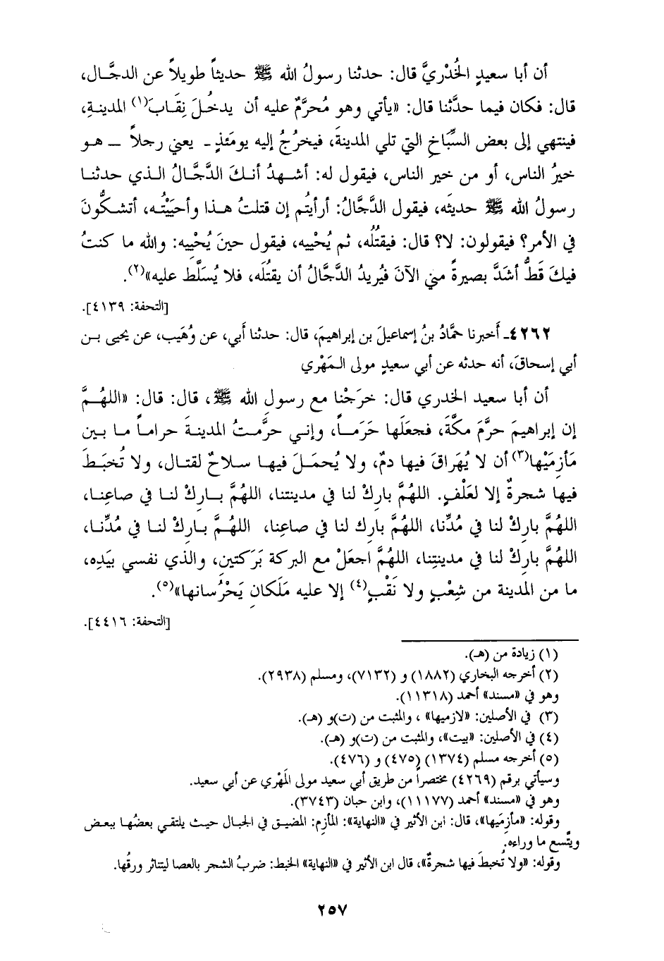 4262 - أَخْبَرَنَا حَمَّادُ بْنُ إِسْمَاعِيلَ بْنِ إِبْرَاهِيمَ، قَالَ: حَدَّثَنَا أَبِي، عَنْ وُهَيْبٍ، عَنْ يَحْيَى بْنِ أَبِي إِسْحَاقَ، أَنَّهُ حَدَّثَهُ عَنْ أَبِي سَعِيدٍ، مَوْلَى الْمَهْرِيِّ، أَنَّ أَبَا سَعِيدٍ الْخُدْرِيَّ، قَالَ: خَرَجْنَا مَعَ رَسُولِ اللهِ صَلَّى اللهُ عَلَيْهِ وَسَلَّمَ قَالَ: قَالَ: «§اللهُمَّ إِنَّ إِبْرَاهِيمَ حَرَّمَ مَكَّةَ فَجَعَلَهَا حَرَمًا وَإِنِّي حَرَّمْتُ الْمَدِينَةَ حَرَامًا مَا بَيْنَ مَأْزِمَيْهَا أَنْ لَا يُهْرَاقَ فِيهَا دَمٌ، وَلَا يُحْمَلُ فِيهَا سِلَاحٌ لِقِتَالٍ، وَلَا تُخْبَطُ فِيهَا شَجَرَةٌ إِلَّا لِعَلْفٍ، اللهُمَّ بَارِكْ لَنَا فِي مَدِينَتِنَا، اللهُمَّ بَارِكْ لَنَا فِي صَاعِنَا، اللهُمَّ بَارِكْ لَنَا فِي مُدِّنَا، اللهُمَّ بَارِكْ لَنَا فِي صَاعِنَا، اللهُمَّ بَارِكْ لَنَا فِي مُدِّنَا، اللهُمَّ بَارِكْ لَنَا فِي مَدِينَتِنَا، اللهُمَّ اجْعَلْ مَعَ الْبَرَكَةِ بَرَكَتَيْنِ، وَالَّذِي نَفْسِي بِيَدِهِ مَا مِنَ الْمَدِينَةِ مِنْ شِعْبٍ وَلَا نَقْبٍ إِلَّا عَلَيْهِ مَلَكَانِ يَحْرُسَانِهَا»