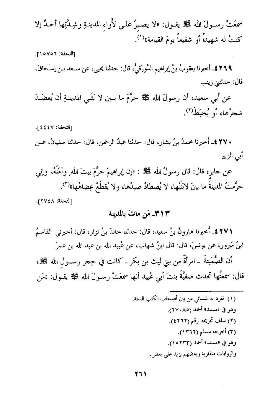 4271 - أخبرنا هَارُونُ بْنُ سَعِيدٍ، قَالَ: حَدَّثَنَا خَالِدُ بْنُ نزِارٍ، قَالَ: أَخْبَرَنِي الْقَاسِمُ بْنُ مَبْرُورٍ، عَنْ يُونُسَ، قَالَ: قَالَ ابْنُ شِهَابٍ، عَنْ عُبَيْدِ اللهِ بْنِ عَبْدِ اللهِ بْنِ عُمَرَ، أَنَّ الصُّمَيْتَةَ امْرَأَةٌ مِنْ بَنِي لَيْثِ بْنِ بَكْرٍ، كَانَتْ فِي حِجْرِ رَسُولِ اللهِ صَلَّى اللهُ عَلَيْهِ وَسَلَّمَ، قَالَ: سَمِعْتُهَا تُحَدِّثُ صَفِيَّةَ بِنْتَ أَبِي عُبَيْدٍ، أَنَّهَا سَمِعَتْ رَسُولَ اللهِ صَلَّى اللهُ عَلَيْهِ وَسَلَّمَ يَقُولُ: «§مَنِ اسْتَطَاعَ مِنْكُمْ أَنْ يَمُوتَ بِالْمَدِينَةِ فَلْيَمُتْ بِهَا؛ فَإِنِّي أَشْفَعُ لَهُ، أَوْ أَشْهَدُ لَهُ»