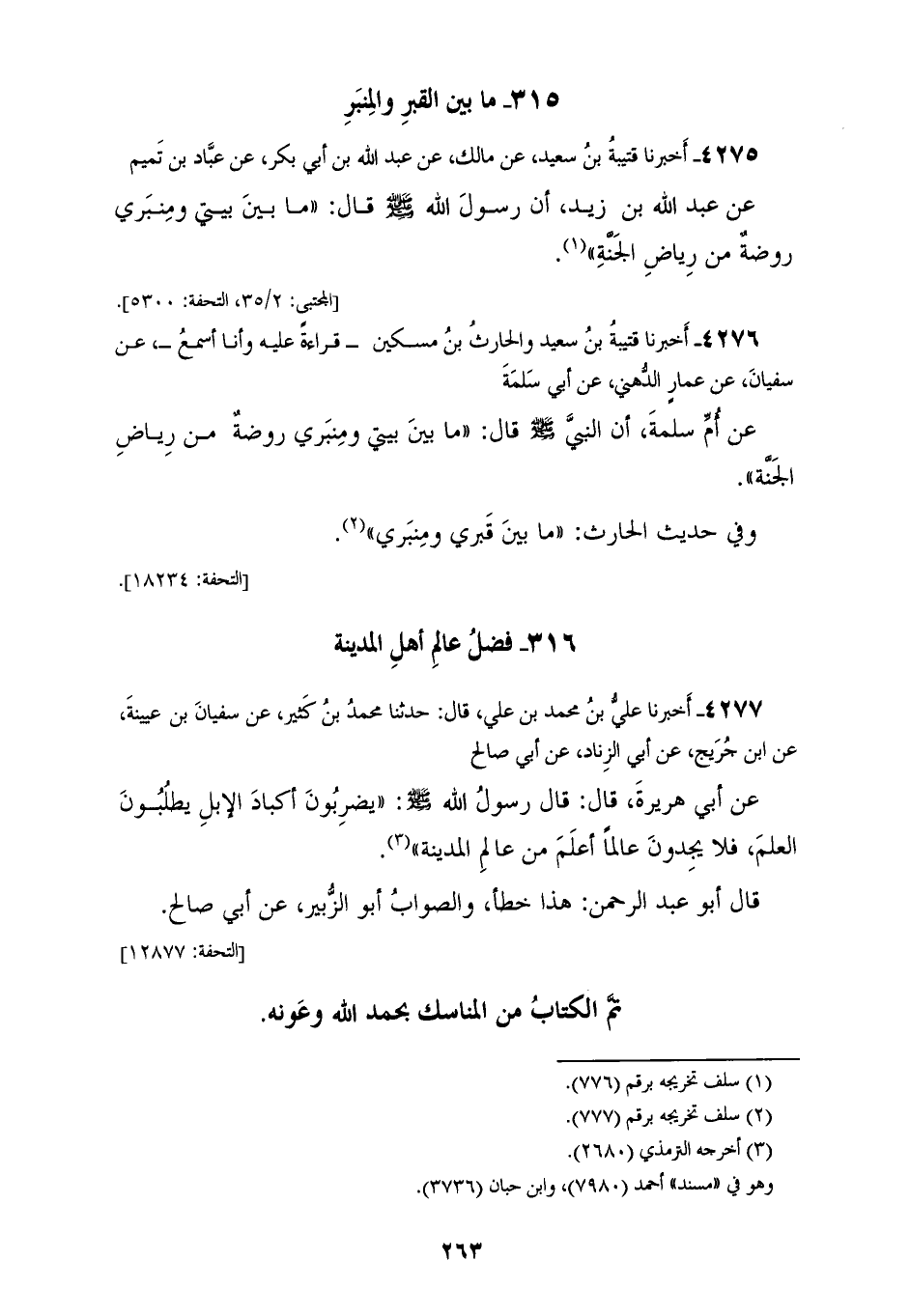 4277 - أَخْبَرَنَا عَلِيُّ بْنُ مُحَمَّدِ بْنِ عَلِيٍّ، قَالَ: حَدَّثَنَا مُحَمَّدُ بْنُ كَثِيرٍ، عَنْ سُفْيَانَ بْنِ عُيَيْنَةَ، عَنِ ابْنِ جُرَيْجٍ، عَنْ أَبِي الزِّنَادِ، عَنْ أَبِي صَالِحٍ، عَنْ أَبِي هُرَيْرَةَ، قَالَ: قَالَ رَسُولُ اللهِ صَلَّى اللهُ عَلَيْهِ وَسَلَّمَ: «§يَضْرِبُونَ أَكْبَادَ الْإِبِلِ يَطْلُبُونَ الْعِلْمَ فَلَا يَجِدُونَ عَالِمًا أَعْلَمَ مِنْ عَالِمِ الْمَدِينَةِ» قَالَ أَبُو عَبْدِ الرَّحْمَنِ: هَذَا خَطَأٌ وَالصَّوَابُ أَبُو الزُّبَيْرِ عَنْ أَبِي صَالِحٍ