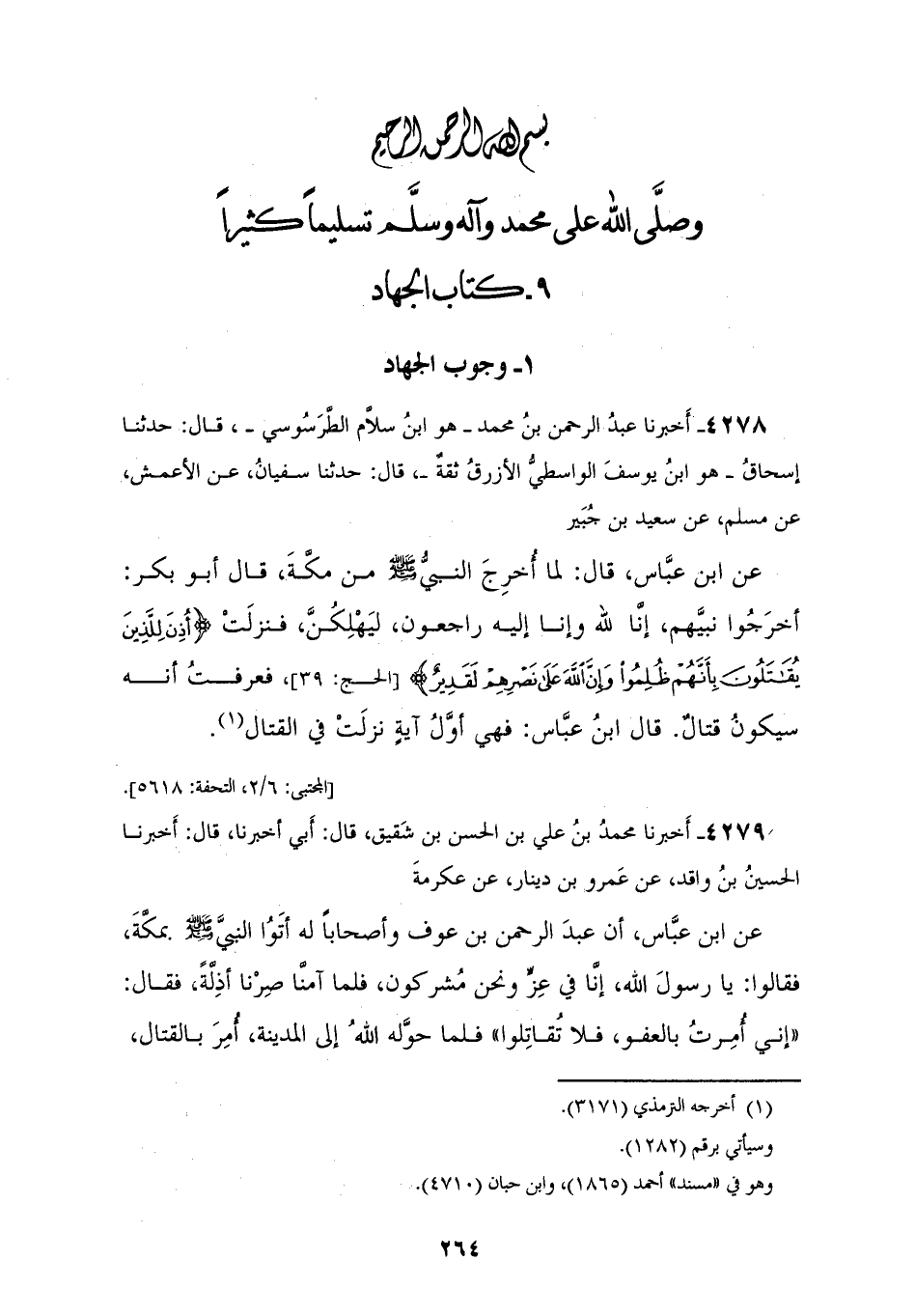 4278 - أَخْبَرَنَا عَبْدُ الرَّحْمَنِ بْنِ مُحَمَّدٍ هُوَ ابْنُ سَلَامٍ الطَّرَسُوسِيُّ، قَالَ: حَدَّثَنَا إِسْحَاقُ هُوَ ابْنُ يُوسُفَ الْوَاسِطِيُّ الْأَزْرَقُ ثِقَةٌ، قَالَ: حَدَّثَنَا سُفْيَانُ، عَنِ الْأَعْمَشِ، عَنْ مُسْلِمٍ، عَنْ سَعِيدِ بْنِ جُبَيْرٍ، عَنِ ابْنِ عَبَّاسٍ قَالَ: لَمَّا أُخْرِجَ النَّبِيُّ صَلَّى اللهُ عَلَيْهِ وَسَلَّمَ مِنْ مَكَّةَ قَالَ أَبُو بَكْرٍ: §أَخْرَجُوا نَبِيَّهُمْ إِنَّا لِلَّهِ، وَإِنَّا إِلَيْهِ رَاجِعُونَ لَيُهْلَكُنَّ، فَنَزَلَتْ {أُذِنَ لِلَّذِينَ يُقَاتَلُونَ بِأَنَّهُمْ ظُلِمُوا وَإِنَّ اللهَ عَلَى نَصْرِهِمْ لَقَدِيرٌ} [الحج: 39] فَعَرَفْتُ أَنَّهُ سَيَكُونُ قِتَالٌ قَالَ ابْنُ عَبَّاسٍ: فَهِيَ أَوَّلُ آيَةٍ نَزَلَتْ فِي الْقِتَالِ
