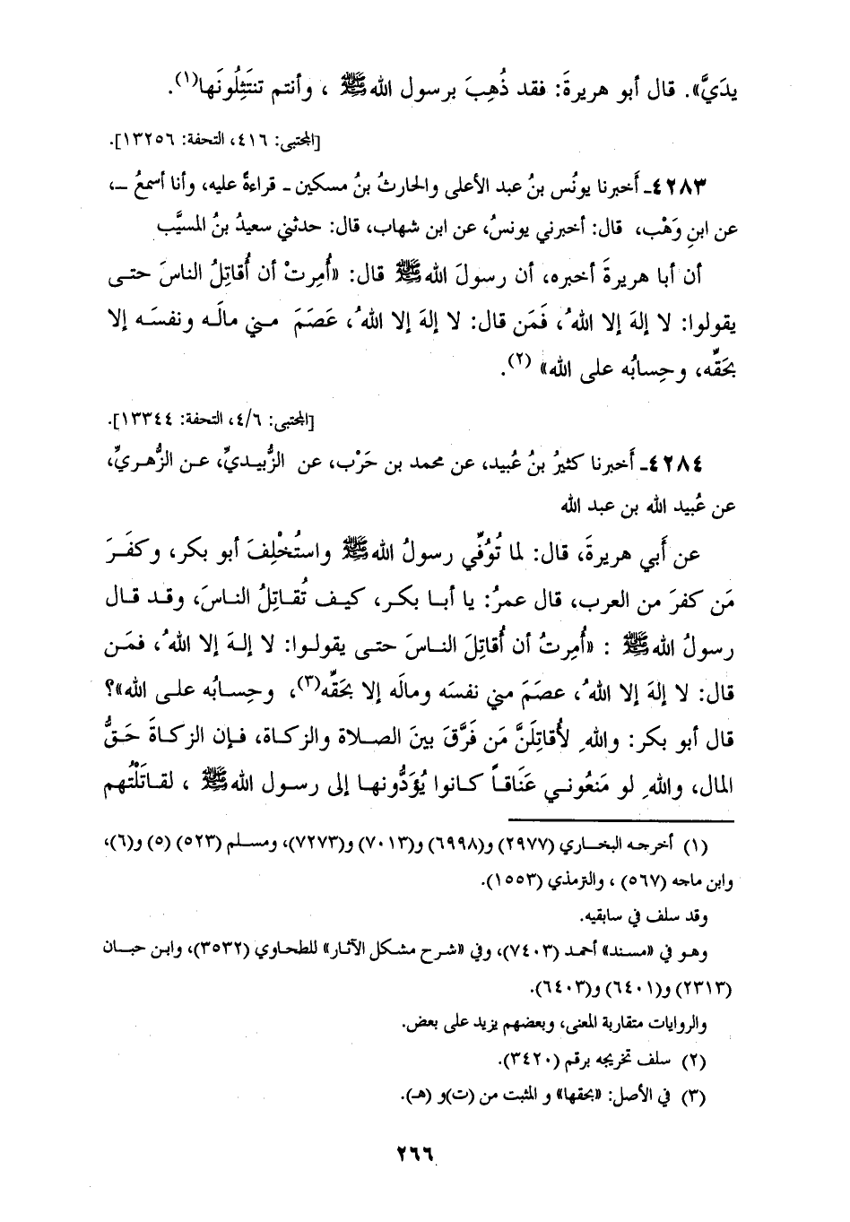 4284 - أَخْبَرَنَا كَثِيرُ بْنُ عُبَيْدٍ، عَنْ مُحَمَّدِ بْنِ حَرْبٍ، عَنِ الزُّبَيْدِيِّ، عَنِ الزُّهْرِيِّ، عَنْ عُبَيْدِ اللهِ بْنِ عَبْدِ اللهِ، عَنْ أَبِي هُرَيْرَةَ قَالَ: لَمَّا تُوُفِّيَ رَسُولُ اللهِ صَلَّى اللهُ عَلَيْهِ وَسَلَّمَ وَاسْتُخْلِفَ أَبُو بَكْرٍ وَكَفَرَ مَنْ كَفَرَ مِنَ الْعَرَبِ قَالَ عُمَرُ: يَا أَبَا بَكْرٍ كَيْفَ تُقَاتِلُ النَّاسَ وَقَدْ قَالَ رَسُولُ اللهِ صَلَّى اللهُ عَلَيْهِ وَسَلَّمَ: " §أُمِرْتُ أَنْ أُقَاتِلَ النَّاسَ حَتَّى يَقُولُوا لَا إِلَهَ إِلَّا اللهُ، فَمَنْ قَالَ: لَا إِلَهَ إِلَّا اللهُ عَصَمَ مِنِّي َنَفْسَهُ وَمَالَهُ إِلَّا بِحَقِّهِ، وَحِسَابُهُ عَلَى اللهِ؟ " قَالَ أَبُو بَكْرٍ: وَاللهِ لَأُقَاتِلَنَّ مَنْ فَرَّقَ بَيْنَ الصَّلَاةِ، وَالزَّكَاةِ فَإِنَّ الزَّكَاةَ حَقُّ الْمَالِ، وَاللهِ لَوْ مَنَعُونِي عَنَاقًا كَانُوا يُؤَدُّونَهَا إِلَى رَسُولِ اللهِ صَلَّى اللهُ عَلَيْهِ وَسَلَّمَ لَقَاتَلْتُهُمْ عَلَى مَنْعِهَا، فَوَاللهِ مَا هُوَ إِلَّا أَنْ رَأَيْتُ أَنَّ اللهَ قَدْ شَرَحَ صَدْرَ أَبِي بَكْرٍ لِلْقِتَالِ عَرَفْتُ أَنَّهُ الْحَقُّ