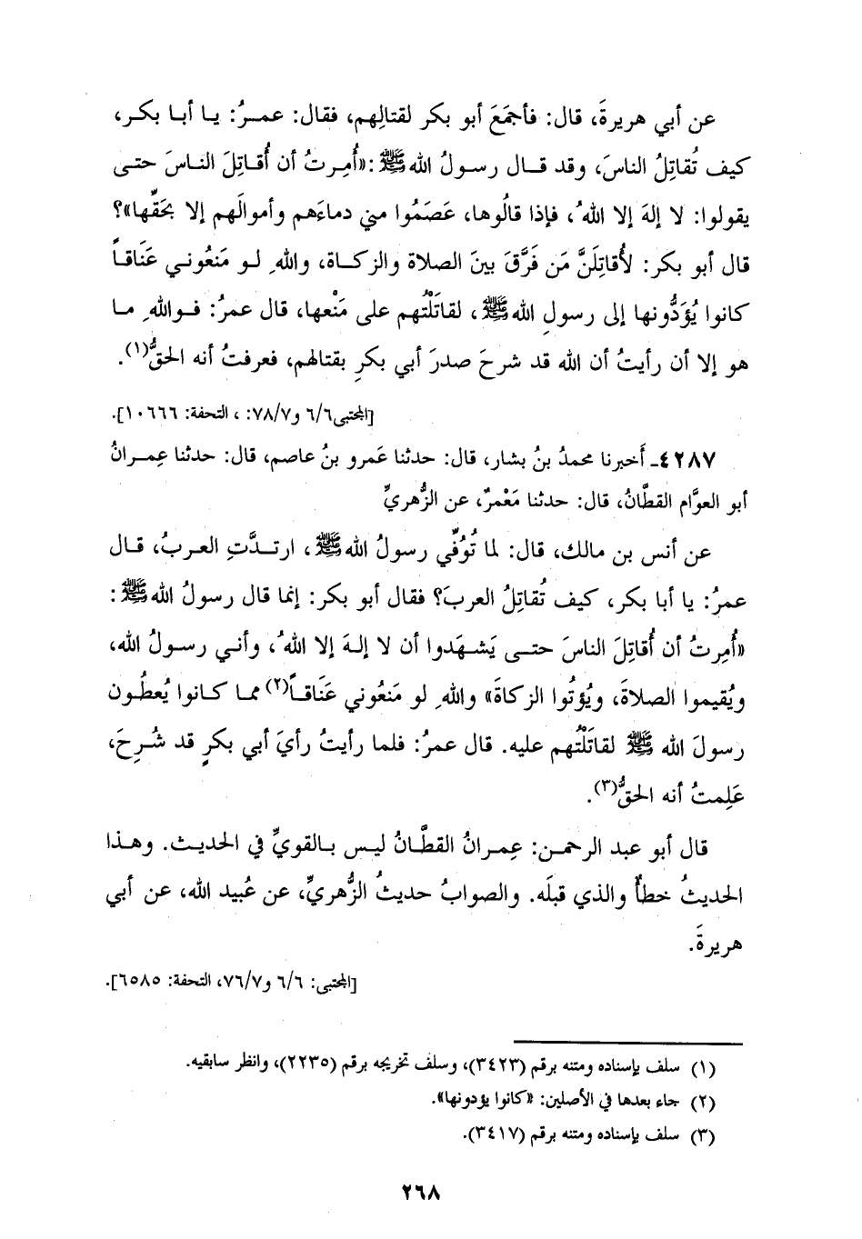 4287 - أَخْبَرَنَا مُحَمَّدُ بْنُ بَشَّارٍ، قَالَ: حَدَّثَنَا عَمْرُو بْنُ عَاصِمٍ قَالَ: حَدَّثَنَا عِمْرَانُ أَبُو الْعَوَّامِ الْقَطَّانُ قَالَ: حَدَّثَنَا مَعْمَرٌ، عَنِ الزُّهْرِيِّ، عَنْ أَنَسِ بْنِ مَالِكٍ قَالَ: لَمَّا تُوُفِّيَ رَسُولُ اللهِ صَلَّى اللهُ عَلَيْهِ وَسَلَّمَ ارْتَدَّتِ الْعَرَبُ، قَالَ عُمَرُ: يَا أَبَا بَكْرٍ كَيْفَ تُقَاتِلُ الْعَرَبَ؟ فَقَالَ أَبُو بَكْرٍ: إِنَّمَا قَالَ رَسُولُ اللهِ صَلَّى اللهُ عَلَيْهِ وَسَلَّمَ: «§أُمِرْتُ أَنْ أُقَاتِلَ النَّاسَ حَتَّى يَشْهَدُوا أَنَّ لَا إِلَهَ إِلَّا اللهُ، وَأَنِّي رَسُولُ اللهِ، وَيُقِيمُوا الصَّلَاةَ، وَيُؤْتُوا الزَّكَاةَ» وَاللهِ لَوْ مَنَعُونِي عَنَاقًا مِمَّا كَانُوا يُعْطُونَ رَسُولَ اللهِ صَلَّى اللهُ عَلَيْهِ وَسَلَّمَ لَقَاتَلْتُهُمْ عَلَيْهِ، قَالَ عُمَرُ: فَلَمَّا رَأَيْتُ رَأْيَ أَبِي بَكْرٍ قَدْ شُرِحَ عَلِمْتُ أَنَّهُ الْحَقُّ، قَالَ أَبُو عَبْدِ الرَّحْمَنِ عِمْرَانُ الْقَطَّانُ: لَيْسَ بِالْقَوِيِّ فِي الْحَدِيثِ وَهَذَا الْحَدِيثُ خَطَأٌ وَالَّذِي قَبْلَهُ وَالصَّوَابُ حَدِيثُ الزُّهْرِيِّ عَنْ عُبَيْدِ اللهِ عَنْ أَبِي هُرَيْرَةَ