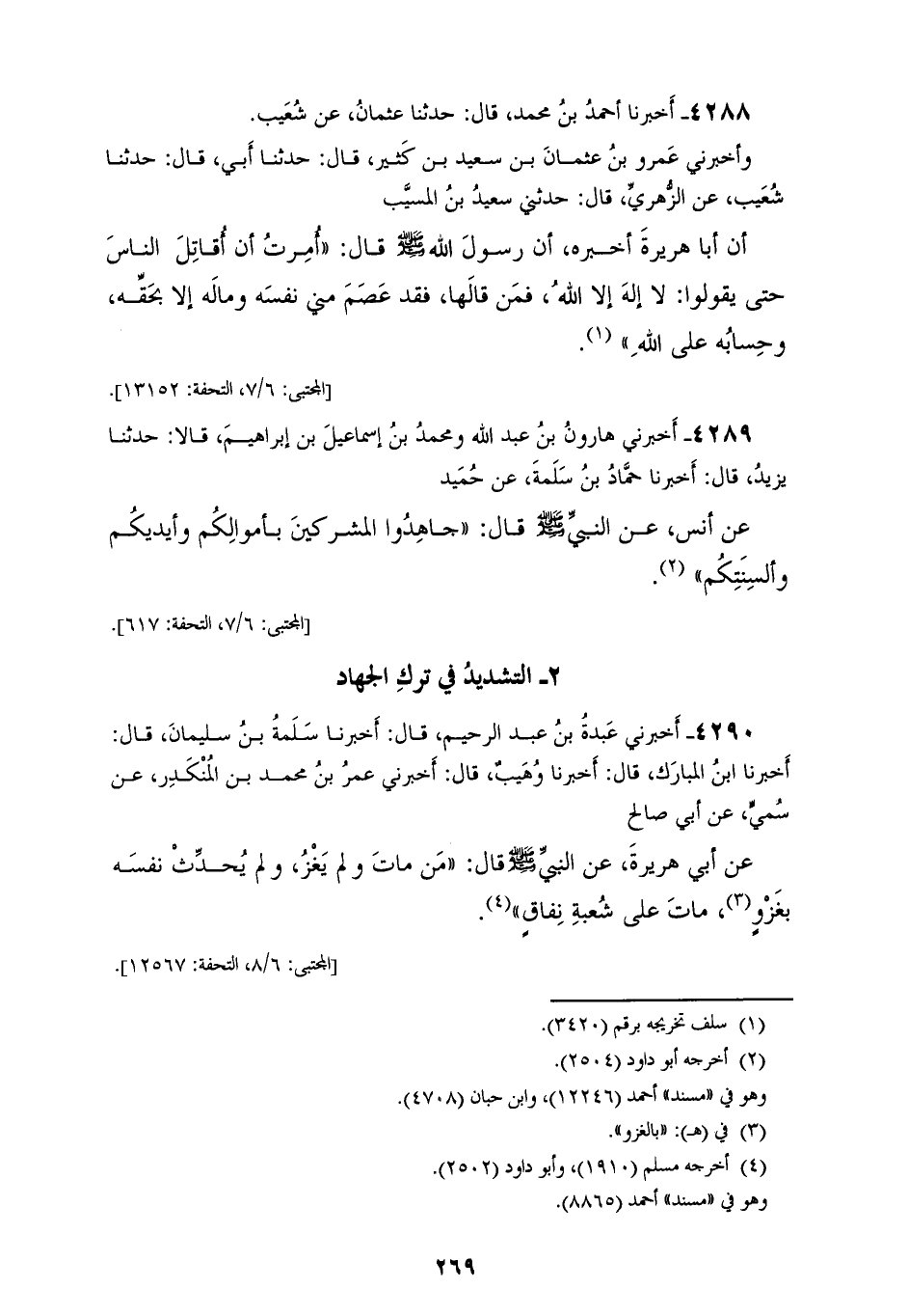 4290 - أَخْبَرَنِي عَبْدَةُ بْنُ عَبْدِ الرَّحِيمِ قَالَ: أَخْبَرَنَا سَلَمَةُ بْنُ سُلَيْمَانَ قَالَ: أَخْبَرَنَا ابْنُ الْمُبَارَكِ قَالَ: أَخْبَرَنَا وُهَيْبٌ قَالَ: أَخْبَرَنِي عُمَرُ بْنُ مُحَمَّدِ بْنِ الْمُنْكَدِرِ، عَنْ سُمَيٍّ، عَنْ أَبِي صَالِحٍ، عَنْ أَبِي هُرَيْرَةَ، عَنِ النَّبِيِّ صَلَّى اللهُ عَلَيْهِ وَسَلَّمَ قَالَ: «§مَنْ مَاتَ وَلَمْ يَغْزُ وَلَمْ يُحَدِّثْ نَفْسَهُ بِغَزْوٍ مَاتَ عَلَى شُعْبَةِ نِفَاقٍ»
