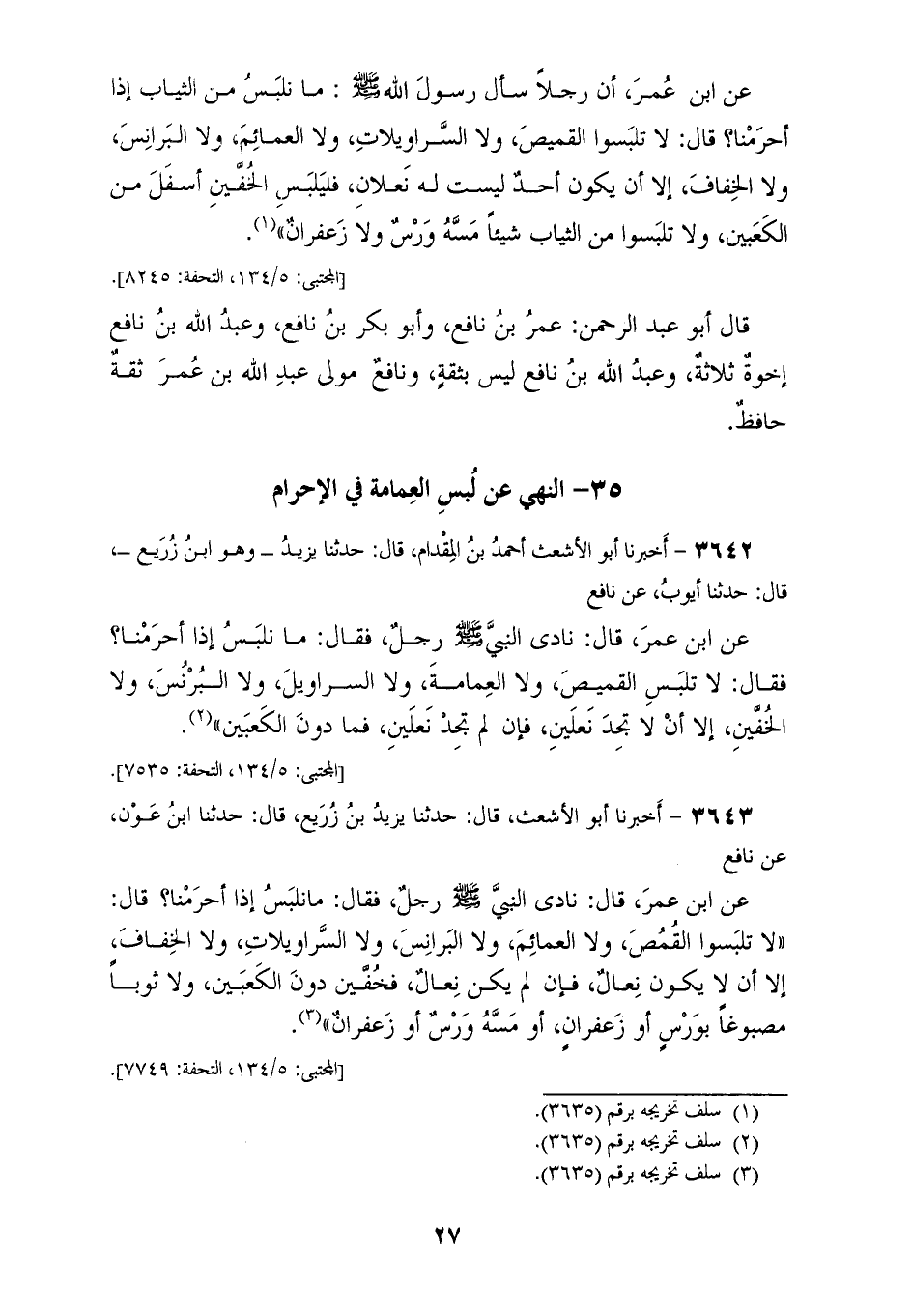 3641 - أَخْبَرَنِي مُحَمَّدُ بْنُ إِسْمَاعِيلَ بْنِ إِبْرَاهِيمَ ابْنِ عُلَيَّةَ، وَعَمْرُو بْنُ عَلِيٍّ أَبُو حَفْصٍ الْفَلَّاسُ، قَالَا حَدَّثَنَا يَزِيدُ، وَهُوَ ابْنُ هَارُونَ قَالَ: أَخْبَرَنَا يَحْيَى، وَهُوَ ابْنُ سَعِيدٍ، عَنْ عُمَرَ بْنِ نَافِعٍ، عَنْ أَبِيهِ، عَنِ ابْنِ عُمَرَ، أَنَّ رَجُلًا سَأَلَ رَسُولَ اللهِ صَلَّى اللهُ عَلَيْهِ وَسَلَّمَ مَا نَلْبَسُ مِنَ الثِّيَابِ إِذَا أَحْرَمْنَا؟ قَالَ: «§لَا تَلْبَسُوا الْقَمِيصَ، وَلَا السَّرَاوِيلَاتِ، وَلَا الْعَمَائِمَ، وَلَا الْبَرَانِسَ، وَلَا الْخِفَافَ إِلَّا أَنْ يَكُونَ أَحَدٌ لَيْسَتْ لَهُ نَعْلَانِ فَلْيَلْبَسِ الْخُفَّيْنِ أَسْفَلَ مِنَ الْكَعْبَيْنِ، وَلَا تَلْبَسُوا مِنَ الثِّيَابِ شَيْئًا مَسَّهُ وَرْسٌ وَلَا زَعْفَرَانٌ» قَالَ أَبُو عَبْدِ الرَّحْمَنِ: عُمَرُ بْنُ نَافِعٍ، وَأَبُو بَكْرِ بْنُ نَافِعٍ، وَعَبْدُ اللهِ بْنُ نَافِعٍ إِخْوَةٌ ثَلَاثَةٌ، وَعَبْدُ اللهِ بْنُ نَافِعٍ لَيْسَ بِثِقَةٍ، وَنَافِعٌ مَوْلَى عَبْدِ اللهِ بْنِ عُمَرَ ثِقَةٌ حَافِظٌ