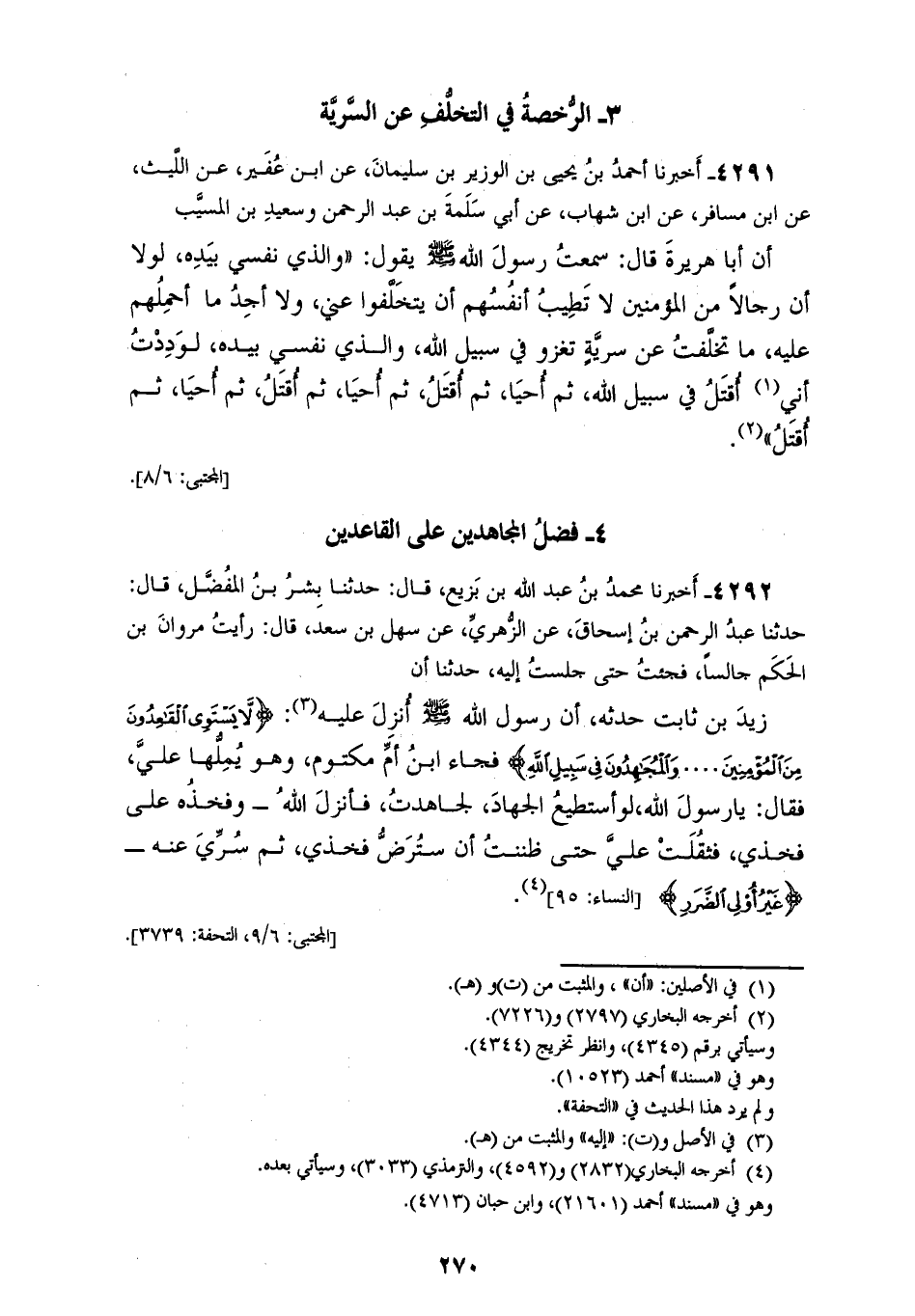 4291 - أَخْبَرَنَا أَحْمَدُ بْنُ يَحْيَى بْنِ الْوَزِيرِ بْنِ سُلَيْمَانَ، عَنِ ابْنِ عُفَيْرٍ، عَنِ اللَّيْثِ، عَنِ ابْنِ مُسَافِرٍ، عَنِ ابْنِ شِهَابٍ، عَنْ أَبِي سَلَمَةَ بْنِ عَبْدِ الرَّحْمَنِ، وَسَعِيدِ بْنِ الْمُسَيِّبِ، أَنَّ أَبَا هُرَيْرَةَ قَالَ: سَمِعْتُ رَسُولَ اللهِ صَلَّى اللهُ عَلَيْهِ وَسَلَّمَ يَقُولُ: «§وَالَّذِي نَفْسِي بِيَدِهِ لَوْلَا أَنَّ رِجَالًا مِنَ الْمُؤْمِنِينَ لَا تَطِيبُ أَنْفُسُهُمْ أَنْ يَتَخَلَّفُوا عَنِّي وَلَا أَجِدُ مَا أَحْمِلُهُمْ عَلَيْهِ مَا تَخَلَّفْتُ عَنْ سَرِيَّةٍ تَغْزُو فِي سَبِيلِ اللهِ، وَالَّذِي نَفْسِي بِيَدِهِ لَوَدِدْتُ أَنِّي أُقْتَلُ فِي سَبِيلِ اللهِ، ثُمَّ أُحْيَا، ثُمَّ أُقْتَلُ، ثُمَّ أُحْيَا، ثُمَّ أُقْتَلُ ثُمَّ أُحْيَا، ثُمَّ أُقْتَلُ»