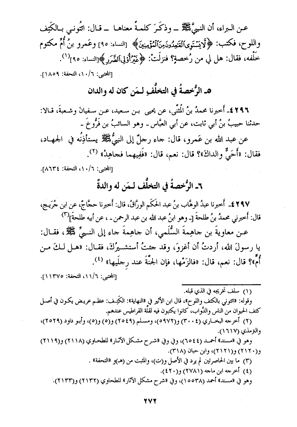 4297 - أَخْبَرَنَا عَبْدُ الْوَهَّابِ بْنِ الْحَكَمِ الْوَرَّاقُ قَالَ: أَخْبَرَنَا حَجَّاجٌ، عَنِ ابْنِ جُرَيْجٍ قَالَ: أَخْبَرَنِي مُحَمَّدُ بْنُ طَلْحَةَ وَهُوَ ابْنُ عَبْدِ اللهِ بْنِ عَبْدِ الرَّحْمَنِ، عَنْ أَبِيهِ طَلْحَةَ، عَنْ مُعَاوِيَةَ بْنِ جَاهِمَةَ السَّلَمِيِّ، أَنَّ جَاهِمَةَ، جَاءَ إِلَى النَّبِيِّ صَلَّى اللهُ عَلَيْهِ وَسَلَّمَ فَقَالَ: يَا رَسُولَ اللهِ أَرَدْتُ أَنْ أَغْزُوَ وَقَدْ جِئْتُ أَسْتَشِيرُكَ فَقَالَ: «§هَلْ لَكَ مِنْ أُمٍّ؟» قَالَ: نَعَمْ قَالَ: «فَالْزَمْهَا فَإِنَّ الْجَنَّةَ عِنْدَ رِجْلَيْهَا»