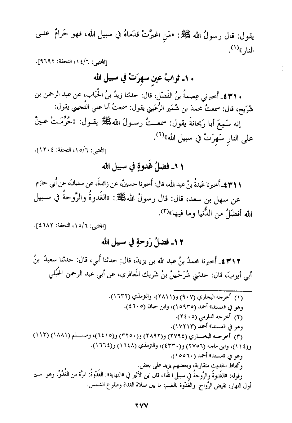 4312 - أَخْبَرَنَا مُحَمَّدُ بْنُ عَبْدِ اللهِ بْنِ يَزِيدَ قَالَ: حَدَّثَنَا أَبِي قَالَ: حَدَّثَنَا سَعِيدُ بْنُ أَبِي أَيُّوبَ، قَالَ: حَدَّثَنِي شُرَحْبِيلُ بْنُ شَرِيكٍ الْمَعَافِرِيُّ، عَنْ أَبِي عَبْدِ الرَّحْمَنِ الْحُبُلِيِّ، أَنَّهُ سَمِعَ أَبَا أَيُّوبَ الْأَنْصَارِيَّ يَقُولُ: قَالَ رَسُولُ اللهِ صَلَّى اللهُ عَلَيْهِ وَسَلَّمَ: «§غَدْوَةٌ فِي سَبِيلِ اللهِ أَوْ رَوْحَةٌ خَيْرٌ مِمَّا طَلَعَتْ عَلَيْهِ الشَّمْسُ وَغَرَبَتْ»