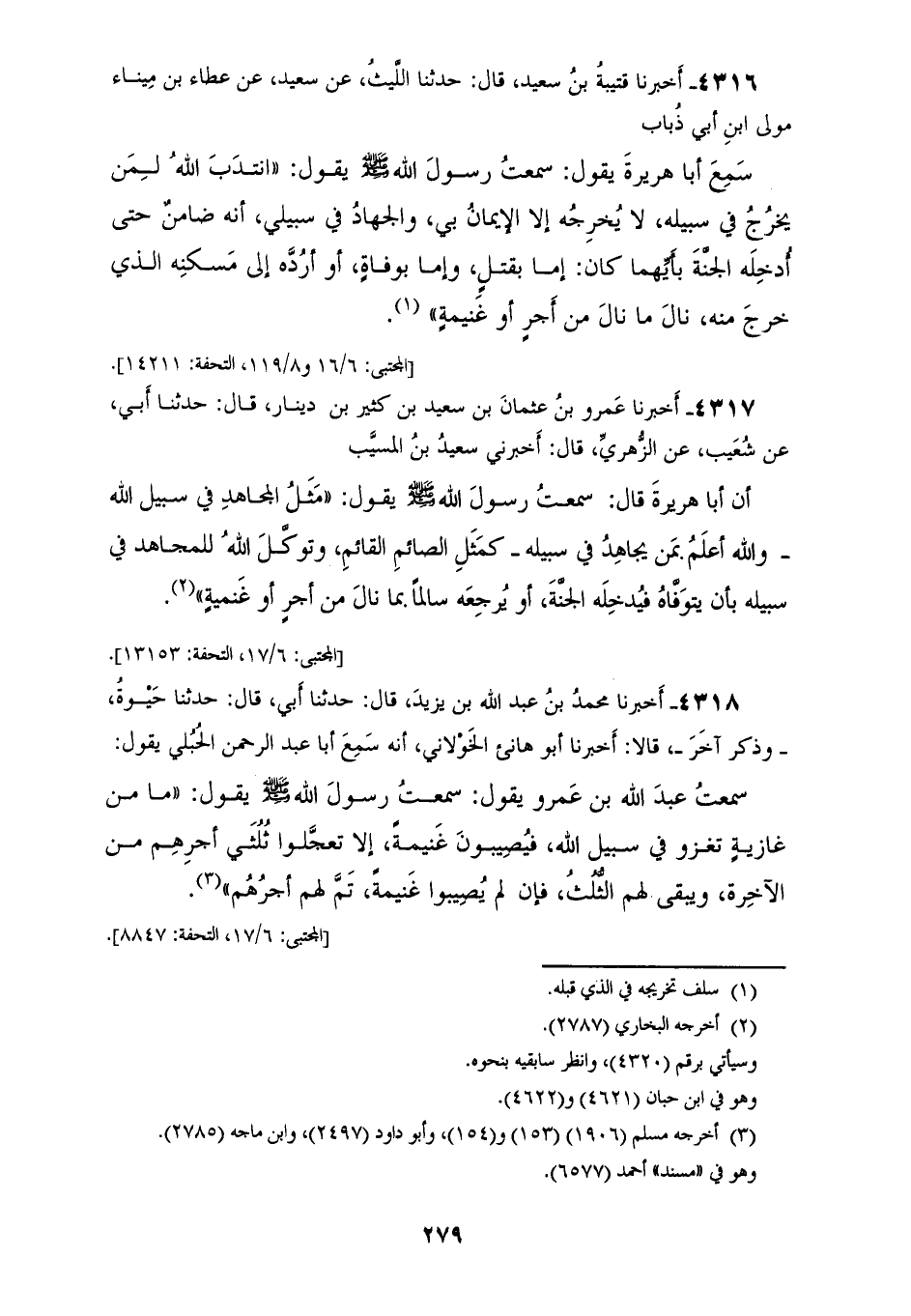 4318 - أَخْبَرَنَا مُحَمَّدُ بْنُ عَبْدِ اللهِ بْنِ يَزِيدَ قَالَ: حَدَّثَنَا أَبِي قَالَ: حَدَّثَنَا حَيْوَةُ، وَذَكَرَ، آخَرَ قَالَا: أَخْبَرَنَا أَبُو هَانِئٍ الْخَوْلَانِيُّ، أَنَّهُ سَمِعَ أَبَا عَبْدِ الرَّحْمَنِ الْحُبُلِيَّ يَقُولُ: سَمِعْتُ عَبْدَ اللهِ بْنَ عَمْرٍو يَقُولُ: سَمِعْتُ رَسُولَ اللهِ صَلَّى اللهُ عَلَيْهِ وَسَلَّمَ يَقُولُ: «§مَا مِنْ غَازِيَةٍ تَغْزُو فِي سَبِيلِ اللهِ فَيُصِيبُونَ غَنِيمَةً إِلَّا تَعَجَّلُوا ثُلُثَيْ أَجْرِهِمْ مِنَ الْآخِرَةِ وَيَبْقَى لَهُمُ الثُّلُثُ، فَإِنْ لَمْ يُصِيبُوا غَنِيمَةً تَمَّ لَهُمْ أَجْرُهُمْ»
