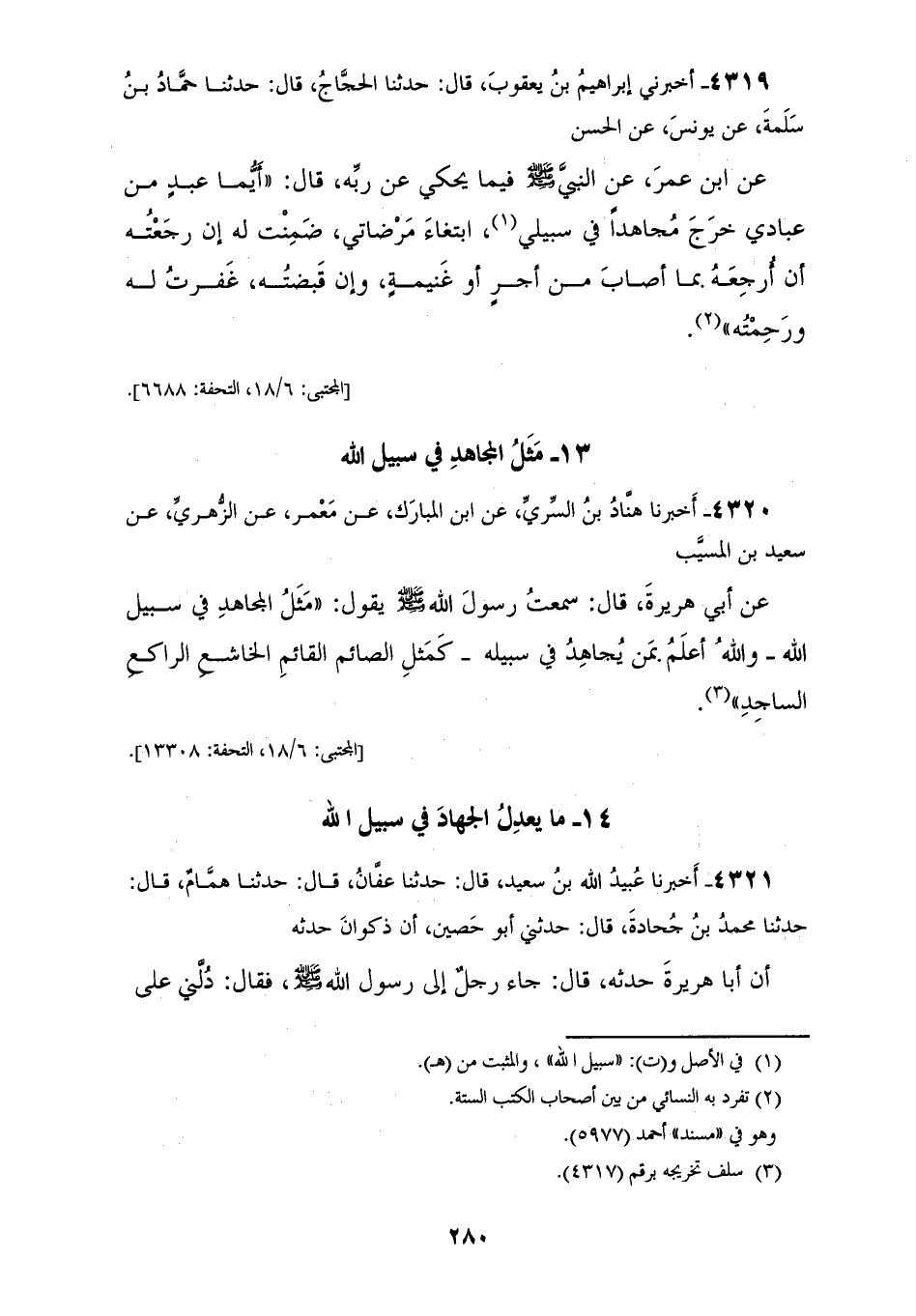 4319 - أَخْبَرَنِي إِبْرَاهِيمُ بْنُ يَعْقُوبَ قَالَ: حَدَّثَنَا الْحَجَّاجُ قَالَ: حَدَّثَنَا حَمَّادُ بْنُ سَلَمَةَ، عَنْ يُونُسَ، عَنِ الْحَسَنِ، عَنِ ابْنِ عُمَرَ، عَنِ النَّبِيِّ صَلَّى اللهُ عَلَيْهِ وَسَلَّمَ فِيمَا يَحْكِي عَنْ رَبِّهِ قَالَ: «§أَيُّمَا عَبْدٍ مِنْ عِبَادِي خَرَجَ مُجَاهِدًا فِي سَبِيلِي ابْتِغَاءَ مَرْضَاتِي ضَمِنْتُ لَهُ إِنْ رَجَعْتُهُ أَنْ أُرْجِعَهُ بِمَا أَصَابَ مِنْ أَجْرٍ أَوْ غَنِيمَةٍ، وَإِنْ قَبَضْتُهُ غَفَرْتُ لَهُ وَرَحِمْتُهُ»