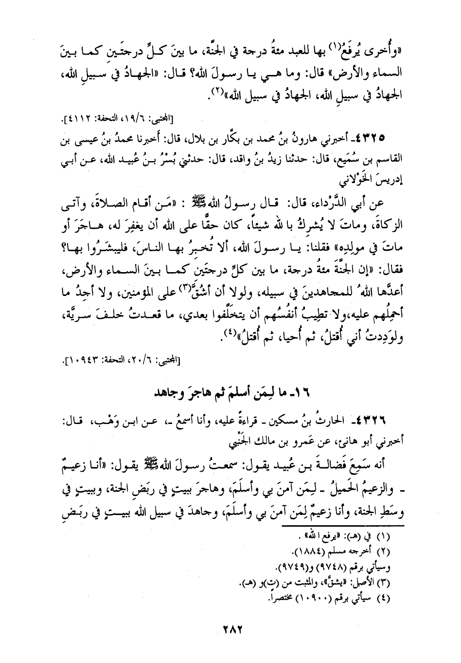4325 - أَخْبَرَنِي هَارُونُ بْنُ مُحَمَّدِ بْنِ بَكَّارِ بْنِ بِلَالٍ قَالَ: أَخْبَرَنَا مُحَمَّدُ بْنُ عِيسَى بْنِ الْقَاسِمِ بْنِ سَمِيعٍ قَالَ: حَدَّثَنَا زَيْدِ بْنُ وَاقِدٍ قَالَ: حَدَّثَنِي بُسْرُ بْنُ عُبَيْدِ اللهِ، عَنْ أَبِي إِدْرِيسَ الْخَوْلَانِيِّ، عَنْ أَبِي الدَّرْدَاءِ قَالَ: قَالَ رَسُولُ اللهِ صَلَّى اللهُ عَلَيْهِ وَسَلَّمَ: «§مَنْ أَقَامَ الصَّلَاةَ وَآتَى الزَّكَاةَ وَمَاتَ لَا يُشْرِكُ بِاللهِ شَيْئًا كَانَ حَقًّا عَلَى اللهِ أَنْ يَغْفِرَ لَهُ هَاجَرَ أَوْ مَاتَ فِي مَوْلِدِهِ» فَقُلْنَا يَا رَسُولَ اللهِ: أَلَا تُخْبِرُ بِهَا النَّاسَ فَلْيُبَشَّرُوا بِهَا؟ فَقَالَ: «إِنَّ الْجَنَّةَ مِائَةُ دَرَجَةٍ مَا بَيْنَ كُلِّ دَرَجَتَيْنِ كَمَا بَيْنَ السَّمَاءِ وَالْأَرْضِ أَعَدَّهَا لِلْمُجَاهِدِينَ فِي سَبِيلِهِ، وَلَوْلَا أَنْ أَشُقَّ عَلَى الْمُؤْمِنِينَ، وَلَا أَجِدُ مَا أَحْمِلُهُمْ عَلَيْهِ، وَلَا تَطِيبُ أَنْفُسُهُمْ أَنْ يَتَخَلَّفُوا بَعْدِي مَا قَعَدْتُ خَلْفَ سَرِيَّةٍ، وَلَوَدِدْتُ أَنِّي أُقْتَلُ ثُمَّ أُحْيَا ثُمَّ أُقْتَلُ»