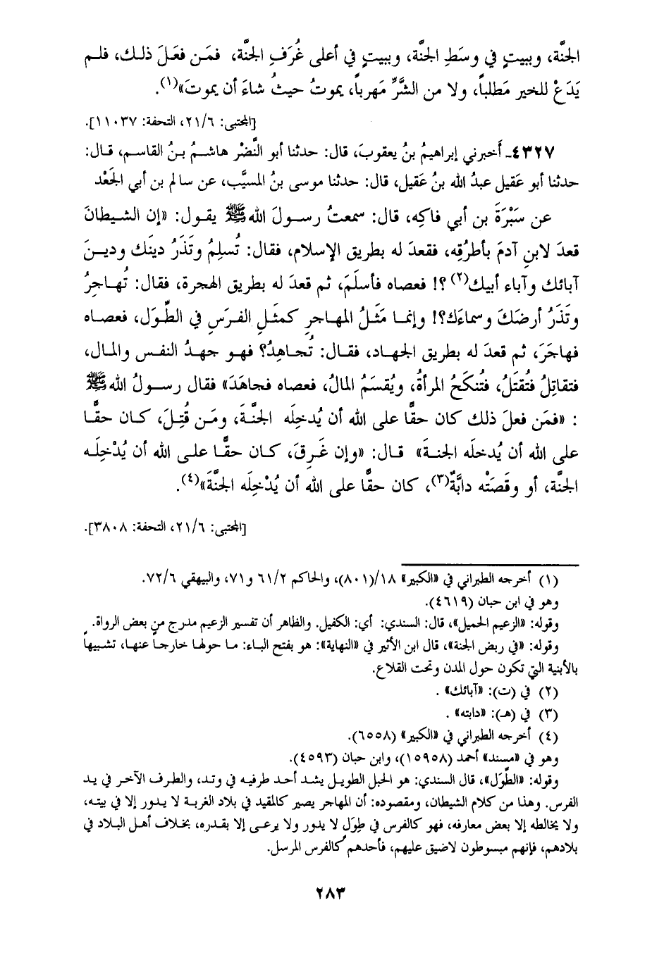 4327 - أَخْبَرَنِي إِبْرَاهِيمُ بْنُ يَعْقُوبَ قَالَ: حَدَّثَنَا أَبُو النَّضْرِ هَاشِمُ بْنُ الْقَاسِمِ قَالَ: حَدَّثَنَا أَبُو عُقَيْلٍ عَبْدُ اللهِ بْنُ عُقَيْلٍ قَالَ: حَدَّثَنَا مُوسَى بْنُ الْمُسَيَّبِ، عَنْ سَالِمِ بْنِ أَبِي الْجَعْدِ، عَنْ سَبْرَةَ بْنِ أَبِي فَاكِهٍ قَالَ: سَمِعْتُ رَسُولَ اللهِ صَلَّى اللهُ عَلَيْهِ وَسَلَّمَ يَقُولُ: " إِنَّ §الشَّيْطَانَ قَعَدَ لِابْنِ آدَمَ بِأَطْرُقِهِ فَقَعَدَ لَهُ بِطَرِيقِ الْإِسْلَامِ فَقَالَ: تُسْلِمُ وَتَذَرُ دِينَكَ وَدِينَ آبَائِكَ وَآبَاءِ أَبِيكَ، فَعَصَاهُ فَأَسْلَمَ، ثُمَّ قَعَدَ لَهُ بِطَرِيقِ الْهِجْرَةِ، فَقَالَ: تُهَاجِرُ وَتَذَرُ أَرْضَكَ وَسَمَاءَكَ، وَإِنَّمَا مَثَلُ الْمُهَاجِرِ كَمَثَلِ الْفَرَسِ فِي الطِّوَلِ فَعَصَاهُ فَهَاجَرَ، ثُمَّ قَعَدَ لَهُ بِطَرِيقِ الْجِهَادِ فَقَالَ: تُجَاهِدُ فَهُوَ جَهْدُ النَّفْسِ وَالْمَالِ فَتُقَاتِلُ فَتُقْتَلُ فَتُنْكَحُ الْمَرْأَةُ وَيُقْسَمُ الْمَالُ فَعَصَاهُ فَجَاهَدَ " فَقَالَ رَسُولُ اللهِ صَلَّى اللهُ عَلَيْهِ وَسَلَّمَ: " فَمَنْ فَعَلَ ذَلِكَ كَانَ حَقًّا عَلَى اللهِ أَنْ يُدْخِلَهُ الْجَنَّةَ، وَمَنْ قُتِلَ كَانَ حَقًّا عَلَى اللهِ أَنْ يُدْخِلَهُ الْجَنَّةَ، قَالَ: وَإِنْ غَرِقَ كَانَ حَقًّا عَلَى اللهِ أَنْ يُدْخِلَهُ الْجَنَّةَ أَوْ وَقَصَتْهُ دَابَّةٌ كَانَ حَقًّا عَلَى اللهِ أَنْ يُدْخِلَهُ الْجَنَّةَ "