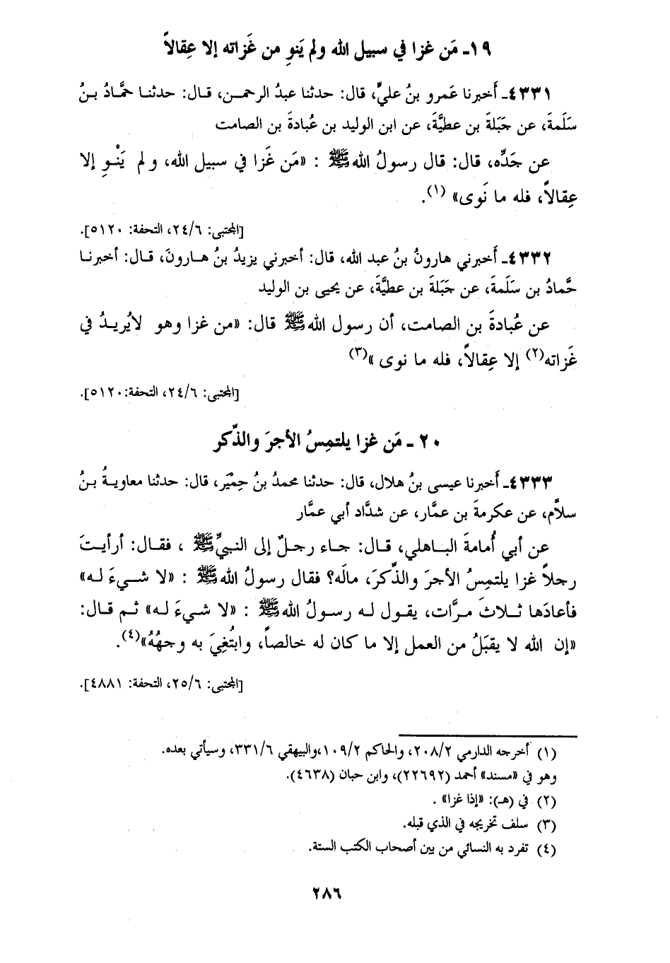 4332 - أَخْبَرَنِي هَارُونُ بْنُ عَبْدِ اللهِ قَالَ: أَخْبَرَنِي يَزِيدُ بْنُ هَارُونَ قَالَ: أَخْبَرَنَا حَمَّادُ بْنُ سَلَمَةَ، عَنْ جَبَلَةَ بْنِ عَطِيَّةَ، عَنْ يَحْيَى بْنِ الْوَلِيدِ، عَنْ عُبَادَةَ بْنِ الصَّامِتِ، أَنَّ رَسُولَ اللهِ صَلَّى اللهُ عَلَيْهِ وَسَلَّمَ قَالَ: «§مَنْ غَزَا وَهُوَ لَا يُرِيدُ فِي غَزَاتِهِ إِلَّا عِقَالًا فَلَهُ مَا نَوَى»