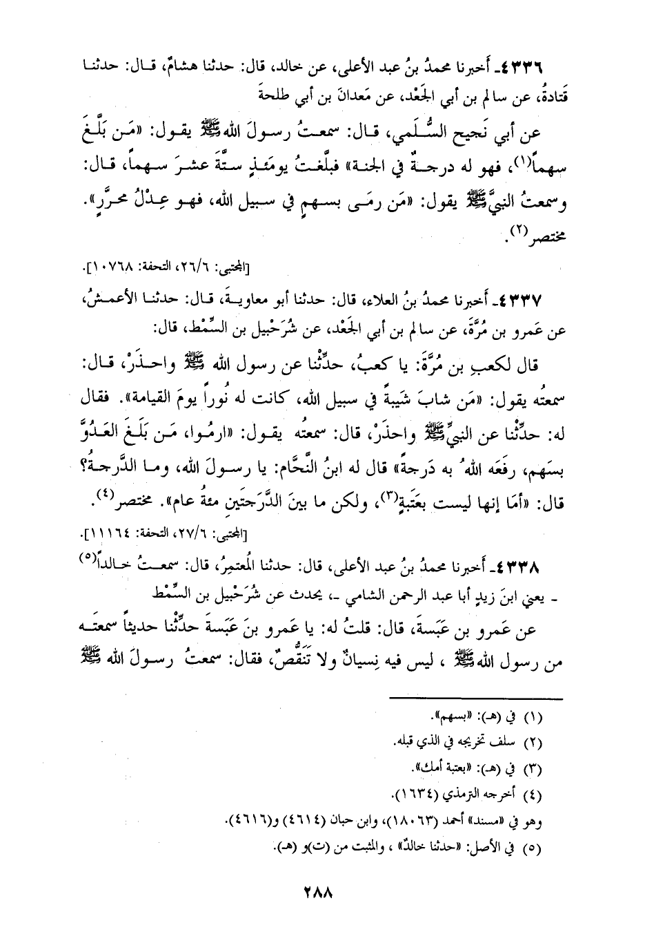 4336 - أَخْبَرَنَا مُحَمَّدُ بْنُ عَبْدِ الْأَعْلَى، عَنْ خَالِدٍ قَالَ: حَدَّثَنَا هِشَامٌ قَالَ: حَدَّثَنَا قَتَادَةُ، عَنْ سَالِمِ بْنِ أَبِي الْجَعْدِ، عَنْ مَعْدَانَ بْنِ أَبِي طَلْحَةَ، عَنْ أَبِي نَجِيحٍ السُّلَمِيِّ قَالَ: سَمِعْتُ رَسُولَ اللهِ صَلَّى اللهُ عَلَيْهِ وَسَلَّمَ يَقُولُ: «§مَنْ بَلَغَ سَهْمًا فَهُوَ لَهُ دَرَجَةٌ فِي الْجَنَّةِ» فَبَلَغْتُ يَوْمَئِذٍ سِتَّةَ عَشَرَ سَهْمًا قَالَ: وَسَمِعْتُ النَّبِيَّ صَلَّى اللهُ عَلَيْهِ وَسَلَّمَ يَقُولُ: «مَنْ رَمَى بِسَهْمٍ فِي سَبِيلِ اللهِ فَهُوَ عِدْلُ مُحَرَّرٍ» مُخْتَصَرٌ
