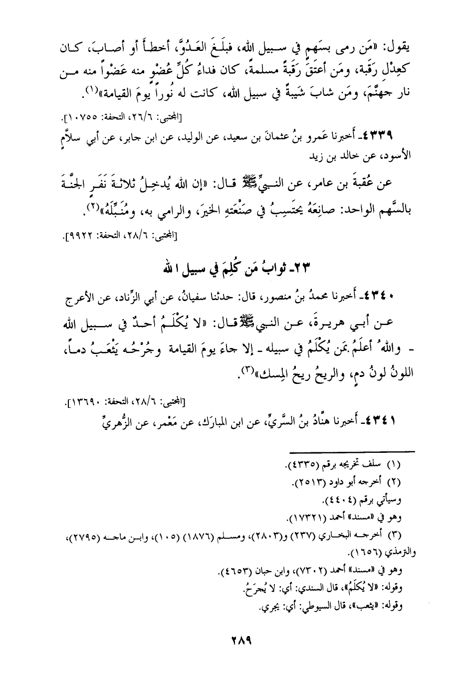 4340 - أَخْبَرَنَا مُحَمَّدُ بْنُ مَنْصُورٍ قَالَ: حَدَّثَنَا سُفْيَانُ، عَنْ أَبِي الزِّنَادِ، عَنِ الْأَعْرَجِ، عَنْ أَبِي هُرَيْرَةَ، عَنِ النَّبِيِّ صَلَّى اللهُ عَلَيْهِ وَسَلَّمَ قَالَ: «§لَا يُكْلَمُ أَحَدٌ فِي سَبِيلِ اللهِ، وَاللهُ أَعْلَمُ بِمَنْ يُكْلَمُ فِي سَبِيلِهِ إِلَّا جَاءَ يَوْمَ الْقِيَامَةِ وَجُرْحُهُ يَثْعَبُ دَمًا اللَّوْنُ لَوْنُ دَمٍ وَالرِّيحُ رِيحُ الْمِسْكِ»