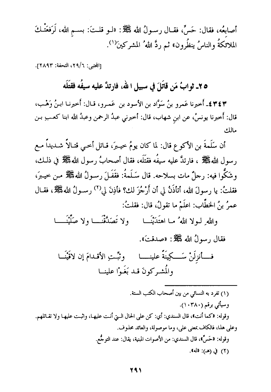 4343 - أَخْبَرَنَا عَمْرُو بْنُ سَوَادٍ بْنِ الْأَسْوَدِ بْنِ عَمْرٍو، قَالَ: أَخْبَرَنَا ابْنُ وَهْبٍ قَالَ: أَخْبَرَنَا يُونُسُ، عَنِ ابْنِ شِهَابٍ قَالَ: أَخْبَرَنِي عَبْدُ الرَّحْمَنِ، وَعَبْدُ اللهِ ابْنَا كَعْبِ بْنِ مَالِكٍ، أَنَّ سَلَمَةَ بْنَ الْأَكْوَعِ قَالَ: لَمَّا كَانَ يَوْمُ خَيْبَرَ قَاتَلَ أَخِي قِتَالًا شَدِيدًا مَعَ رَسُولِ اللهِ صَلَّى اللهُ عَلَيْهِ وَسَلَّمَ فَارْتَدَّ عَلَيْهِ سَيْفُهُ فَقَتَلَهُ، فَقَالَ أَصْحَابُ رَسُولِ اللهِ صَلَّى اللهُ عَلَيْهِ وَسَلَّمَ فِي ذَلِكَ وَشَكَوْا فِيهِ: رَجُلٌ مَاتَ بِسِلَاحِهِ، قَالَ سَلَمَةُ: فَقَفَلَ رَسُولُ اللهِ صَلَّى اللهُ عَلَيْهِ وَسَلَّمَ مِنْ خَيْبَرَ فَقُلْتُ: يَا رَسُولَ اللهِ أَتَأْذَنُ لِي أَنْ أَرْجُزَ لَكَ؟ فَأَذِنَ لِي رَسُولُ اللهِ صَلَّى اللهُ عَلَيْهِ وَسَلَّمَ، فَقَالَ عُمَرُ بْنُ الْخَطَّابِ: اعْلَمْ مَا تَقُولُ، قَالَ: فَقُلْتُ: