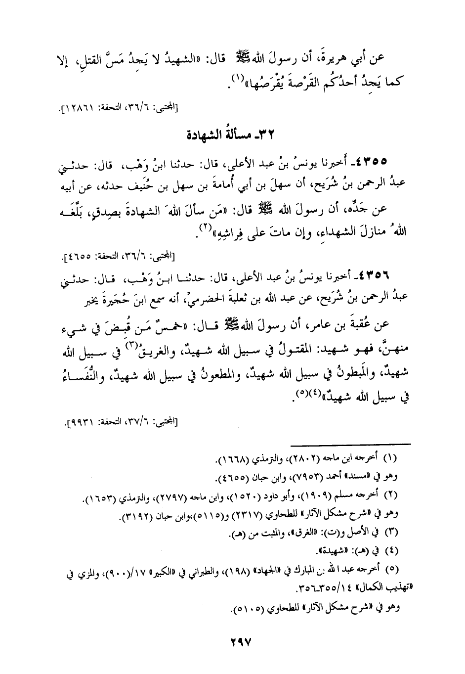4355 - أَخْبَرَنَا يُونُسُ بْنُ عَبْدِ الْأَعْلَى قَالَ: حَدَّثَنَا ابْنُ وَهْبٍ قَالَ: حَدَّثَنِي عَبْدُ الرَّحْمَنِ بْنُ شُرَيْحٍ، أَنَّ سَهْلَ بْنَ أَبِي أُمَامَةَ بْنِ سَهْلِ بْنِ حُنَيْفٍ، حَدَّثَهُ عَنْ أَبِيهِ، عَنْ جَدِّهِ، أَنَّ رَسُولَ اللهِ صَلَّى اللهُ عَلَيْهِ وَسَلَّمَ قَالَ: «§مَنْ سَأَلَ اللهَ الشَّهَادَةَ بِصِدْقٍ بَلَّغَهُ اللهُ مَنَازِلَ الشُّهَدَاءِ، وَإِنْ مَاتَ عَلَى فِرَاشِهِ»