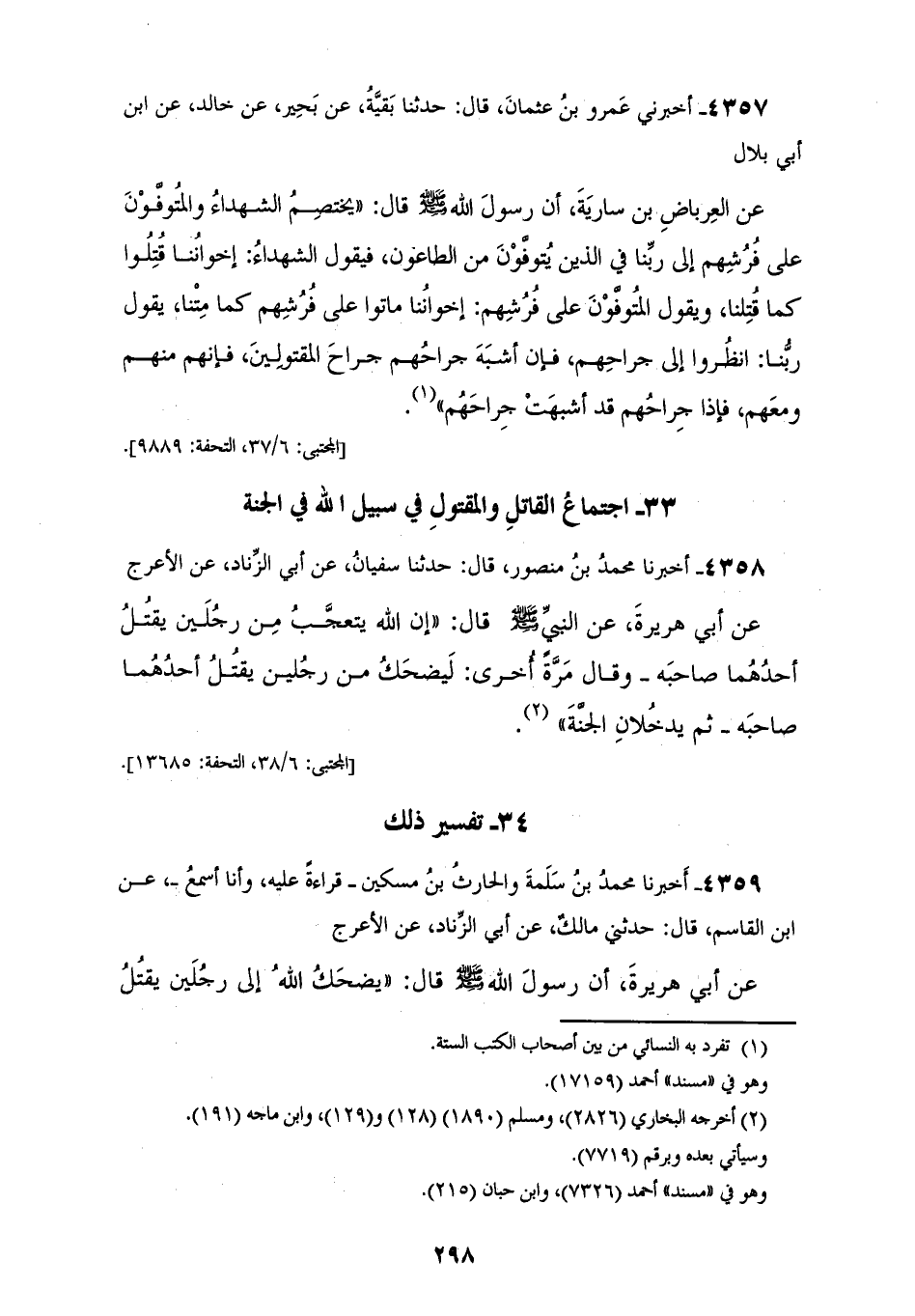 4359 - أَخْبَرَنَا مُحَمَّدُ بْنُ سَلَمَةَ، وَالْحَارِثُ بْنُ مِسْكِينٍ، قِرَاءَةً عَلَيْهِ وَأَنَا أَسْمَعُ، عَنِ ابْنِ الْقَاسِمِ، قَالَ: حَدَّثَنِي مَالِكٌ، عَنْ أَبِي الزِّنَادِ، عَنِ الْأَعْرَجِ، عَنْ أَبِي هُرَيْرَةَ، أَنَّ رَسُولَ اللهِ صَلَّى اللهُ عَلَيْهِ وَسَلَّمَ قَالَ: «§يَضْحَكُ اللهُ إِلَى رَجُلَيْنِ يَقْتُلُ أَحَدُهُمَا الْآخَرَ، كِلَاهُمَا يَدْخُلُ الْجَنَّةَ يُقَاتِلُ هَذَا فِي سَبِيلِ اللهِ فَيُقْتَلُ، ثُمَّ يَتُوبُ اللهُ عَلَى الْقَاتِلِ فَيُقَاتِلُ فَيُسْتَشْهَدُ»