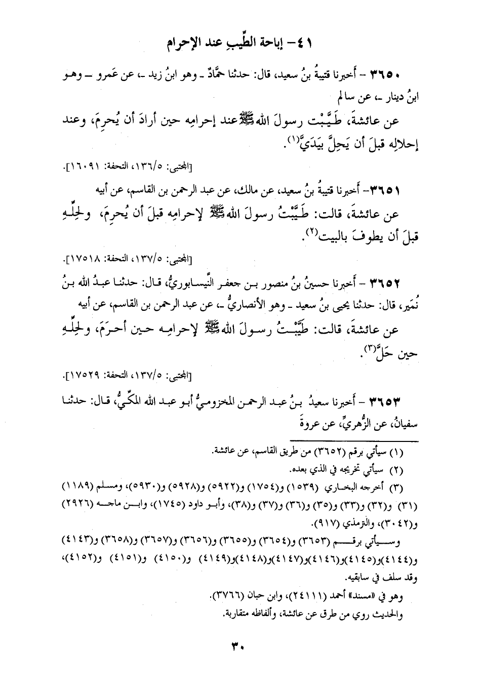 3650 - أَخْبَرَنَا قُتَيْبَةُ بْنُ سَعِيدٍ قَالَ: حَدَّثَنَا حَمَّادٌ، وَهُوَ ابْنُ زَيْدٍ، عَنْ عَمْرٍو، وَهُوَ ابْنُ دِينَارٍ، عَنْ سَالِمٍ، عَنْ عَائِشَةَ «§طَيَّبْتُ رَسُولَ اللهِ صَلَّى اللهُ عَلَيْهِ وَسَلَّمَ عِنْدَ إِحْرَامِهِ حِينَ أَرَادَ أَنْ يُحْرِمَ، وَعِنْدَ إِحْلَالِهِ قَبْلَ أَنْ يُحِلَّ بِيَدِي»