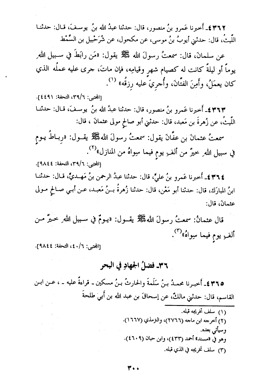 4363 - أَخْبَرَنَا عَمْرُو بْنُ مَنْصُورٍ قَالَ: حَدَّثَنَا عَبْدُ اللهِ بْنُ يُوسُفَ قَالَ: حَدَّثَنَا اللَّيْثُ، عَنْ زُهْرَةَ بْنِ مَعْبَدٍ قَالَ: حَدَّثَنِي أَبُو صَالِحٍ، مَوْلَى عُثْمَانَ قَالَ: سَمِعْتُ عُثْمَانَ بْنَ عَفَّانَ يَقُولُ: سَمِعْتُ رَسُولَ اللهِ صَلَّى اللهُ عَلَيْهِ وَسَلَّمَ يَقُولُ: «§رِبَاطُ يَوْمٍ فِي سَبِيلِ اللهِ خَيْرٌ مِنْ أَلْفِ يَوْمٍ فِيمَا سِوَاهُ مِنَ الْمَنَازِلِ»