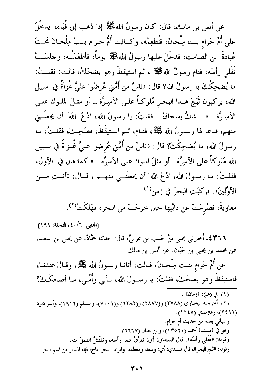 4365 - أَخْبَرَنَا مُحَمَّدُ بْنُ سَلَمَةَ، وَالْحَارِثُ بْنُ مِسْكِينٍ، قِرَاءَةً عَلَيْهِ عَنِ ابْنِ الْقَاسِمِ، قَالَ: حَدَّثَنِي مَالِكٌ، عَنْ إِسْحَاقَ بْنِ عَبْدِ اللهِ بْنِ أَبِي طَلْحَةَ، عَنْ أَنَسِ بْنِ مَالِكٍ قَالَ: كَانَ رَسُولُ اللهِ صَلَّى اللهُ عَلَيْهِ وَسَلَّمَ إِذَا ذَهَبَ إِلَى قُبَاءَ يَدْخُلُ عَلَى أُمِّ حَرَامِ بِنْتِ مِلْحَانَ فَتُطْعِمُهُ، وَكَانَتْ أُمُّ حَرَامِ بِنْتُ مِلْحَانَ تَحْتَ عُبَادَةَ بْنِ الصَّامِتِ، فَدَخَلَ عَلَيْهَا رَسُولُ اللهِ صَلَّى اللهُ عَلَيْهِ وَسَلَّمَ يَوْمًا، فَأَطْعَمَتْهُ وَجَلَسَتْ تُفَلِّي رَأْسَهُ فَنَامَ رَسُولُ اللهِ صَلَّى اللهُ عَلَيْهِ وَسَلَّمَ ثُمَّ اسْتَيْقَظَ وَهُوَ يَضْحَكُ قَالَتْ: فَقُلْتُ: مَا يُضْحِكُكَ يَا رَسُولَ اللهِ؟ قَالَ: «§نَاسٌ مِنْ أُمَّتِي عُرِضُوا عَلَيَّ غَزَاةً فِي سَبِيلِ اللهِ يَرْكَبُونَ ثَبَجَ هَذَا الْبَحْرِ مُلُوكًا عَلَى الْأَسِرَّةِ» أَوْ مِثْلَ الْمُلُوكِ عَلَى الْأَسِرَّةِ شَكَّ إِسْحَاقُ فَقُلْتُ: يَا رَسُولَ اللهِ ادْعُ اللهَ أَنْ يَجْعَلَنِي مِنْهُمْ، فَدَعَا لَهَا رَسُولُ اللهِ صَلَّى اللهُ عَلَيْهِ وَسَلَّمَ فَنَامَ، ثُمَّ اسْتَيْقَظَ فَضَحِكَ فَقُلْتُ: يَا رَسُولَ اللهِ مَا يُضْحِكُكَ؟ قَالَ: «نَاسٌ مِنْ أُمَّتِي عُرِضُوا عَلَيَّ غَزَاةً فِي سَبِيلِ اللهِ مُلُوكًا عَلَى الْأَسِرَّةِ» أَوْ مِثْلَ الْمُلُوكِ عَلَى الْأَسِرَّةِ كَمَا قَالَ فِي الْأَوَّلِ فَقُلْتُ: يَا رَسُولَ اللهِ ادْعُ اللهَ أَنْ يَجْعَلَنِي مِنْهُمْ قَالَ: «أَنْتِ مِنَ الْأَوَّلِينَ، فَرَكِبَتِ الْبَحْرَ فِي زَمَنِ مُعَاوِيَةَ فَصُرِعَتْ عَنْ دَابَّتِهَا حِينَ خَرَجَتْ مِنَ الْبَحْرِ فَهَلَكَتْ»