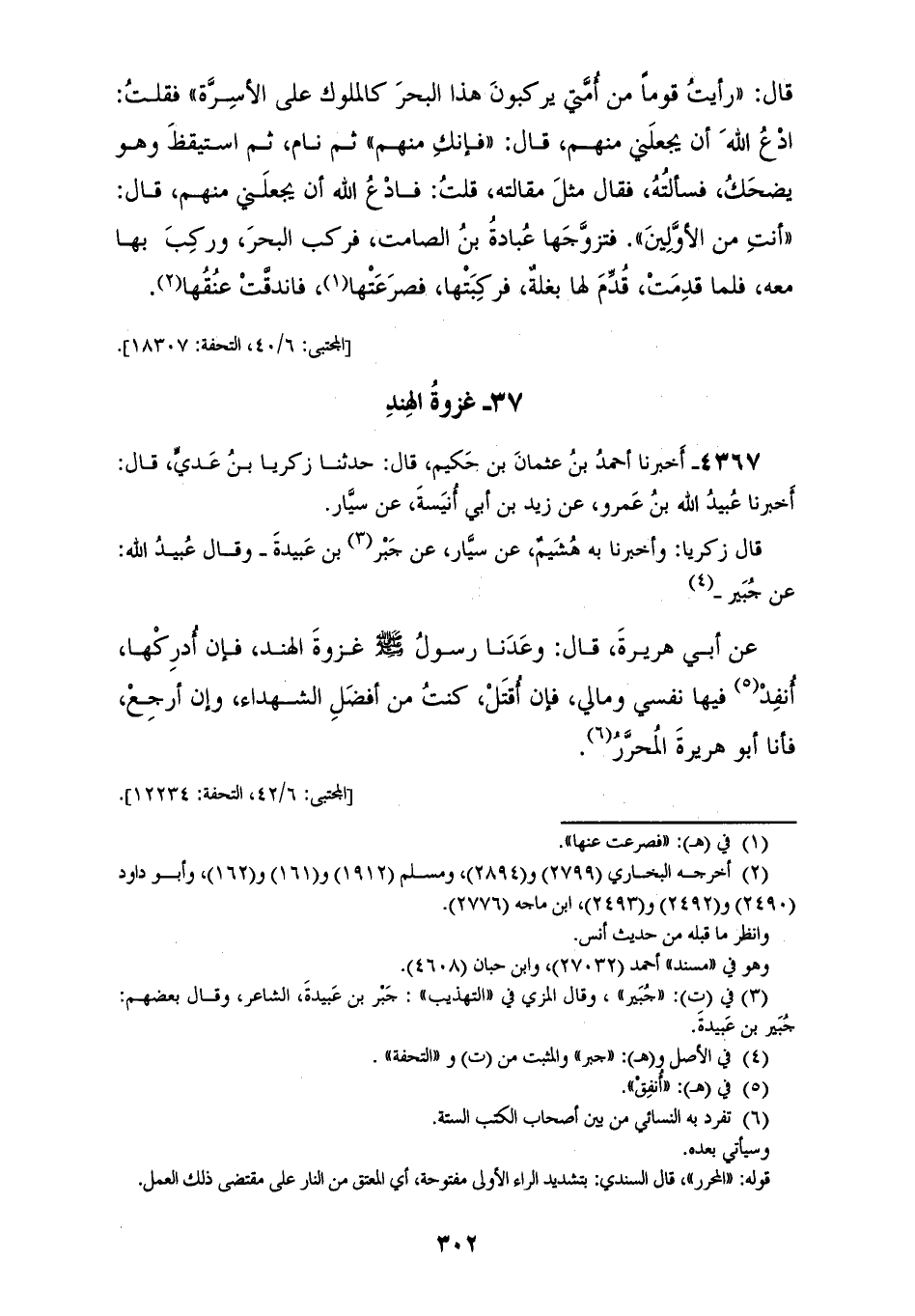 4367 - أَخْبَرَنَا أَحْمَدُ بْنُ عُثْمَانَ بْنِ حَكِيمٍ قَالَ: حَدَّثَنَا زَكَرِيَّا بْنُ عَدِيٍّ قَالَ: أَخْبَرَنَا عُبَيْدُ اللهِ بْنُ عَمْرٍو، عَنْ زَيْدِ بْنِ أَبِي أُنَيْسَةَ، عَنْ سَيَّارٍ، قَالَ زَكَرِيَّا، وَأَخْبَرَنَا بِهِ هُشَيْمٌ، عَنْ سَيَّارٍ، عَنْ جُبَيْرِ بْنِ عُبَيْدَةَ وَقَالَ: عُبَيْدُ اللهِ، عَنْ جُبَيْرٍ، عَنْ أَبِي هُرَيْرَةَ قَالَ: «§وَعَدَنَا رَسُولُ اللهِ صَلَّى اللهُ عَلَيْهِ وَسَلَّمَ غَزْوَةَ الْهِنْدِ» فَإِنْ أُدْرِكْهَا أُنْفِدُ فِيهَا نَفْسِي وَمَالِي فَإِنْ أُقْتَلُ كُنْتُ مِنْ أَفْضَلِ الشُّهَدَاءِ، وَإِنْ أَرْجِعْ فَأَنَا أَبُو هُرَيْرَةَ الْمُحَرَّرُ