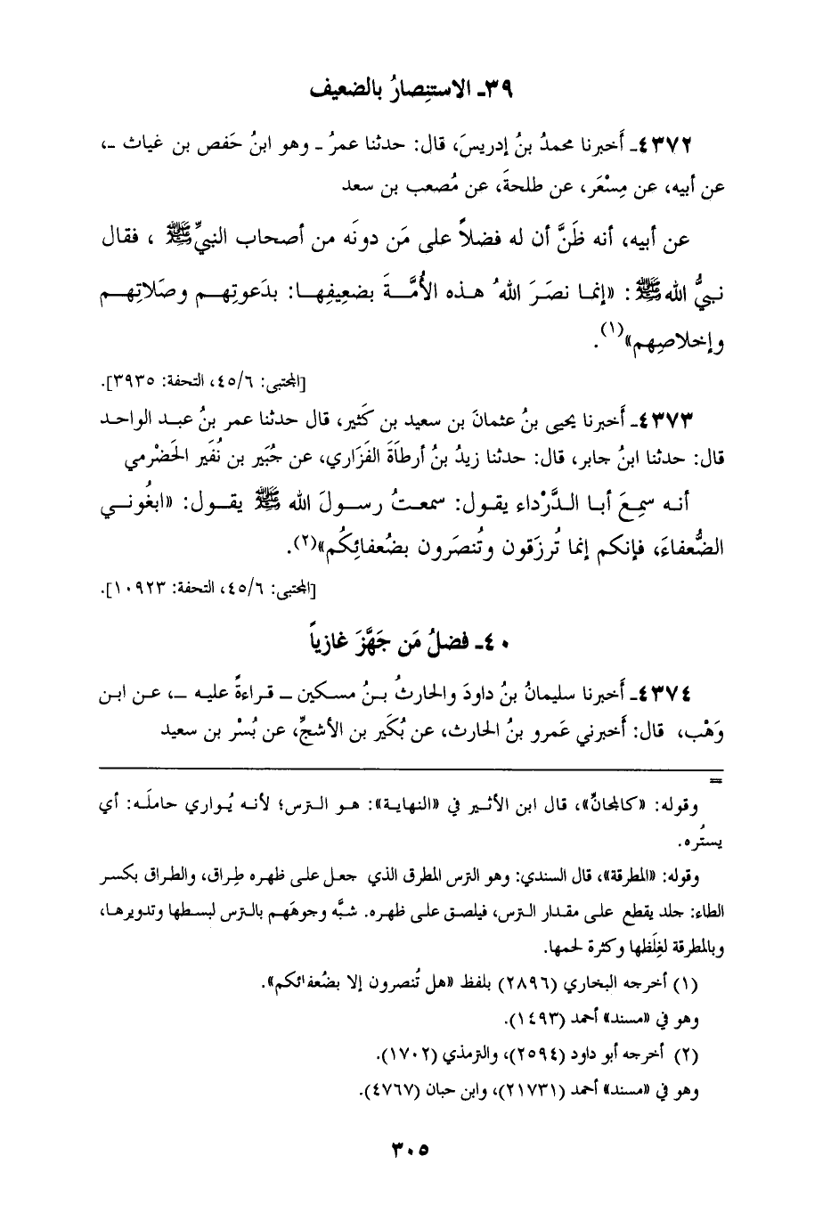 4372 - أَخْبَرَنَا مُحَمَّدُ بْنُ إِدْرِيسَ قَالَ: حَدَّثَنَا عُمَرُ وَهُوَ ابْنُ حَفْصِ بْنِ غِيَاثٍ، عَنْ أَبِيهِ، عَنْ مِسْعَرٍ، عَنْ طَلْحَةَ، عَنْ مُصْعَبِ بْنِ سَعْدٍ، عَنْ أَبِيهِ، أَنَّهُ ظَنَّ أَنَّ لَهُ، فَضْلًا عَلَى مَنْ دُونَهُ مِنْ أَصْحَابِ النَّبِيِّ صَلَّى اللهُ عَلَيْهِ وَسَلَّمَ فَقَالَ نَبِيُّ اللهِ صَلَّى اللهُ عَلَيْهِ وَسَلَّمَ: «إِنَّمَا §نَصْرُ اللهُ هَذِهِ الْأُمَّةَ بِضَعِيفِهَا بِدَعْوَتِهِمْ وَصَلَاتِهِمْ وَإِخْلَاصِهِمْ»