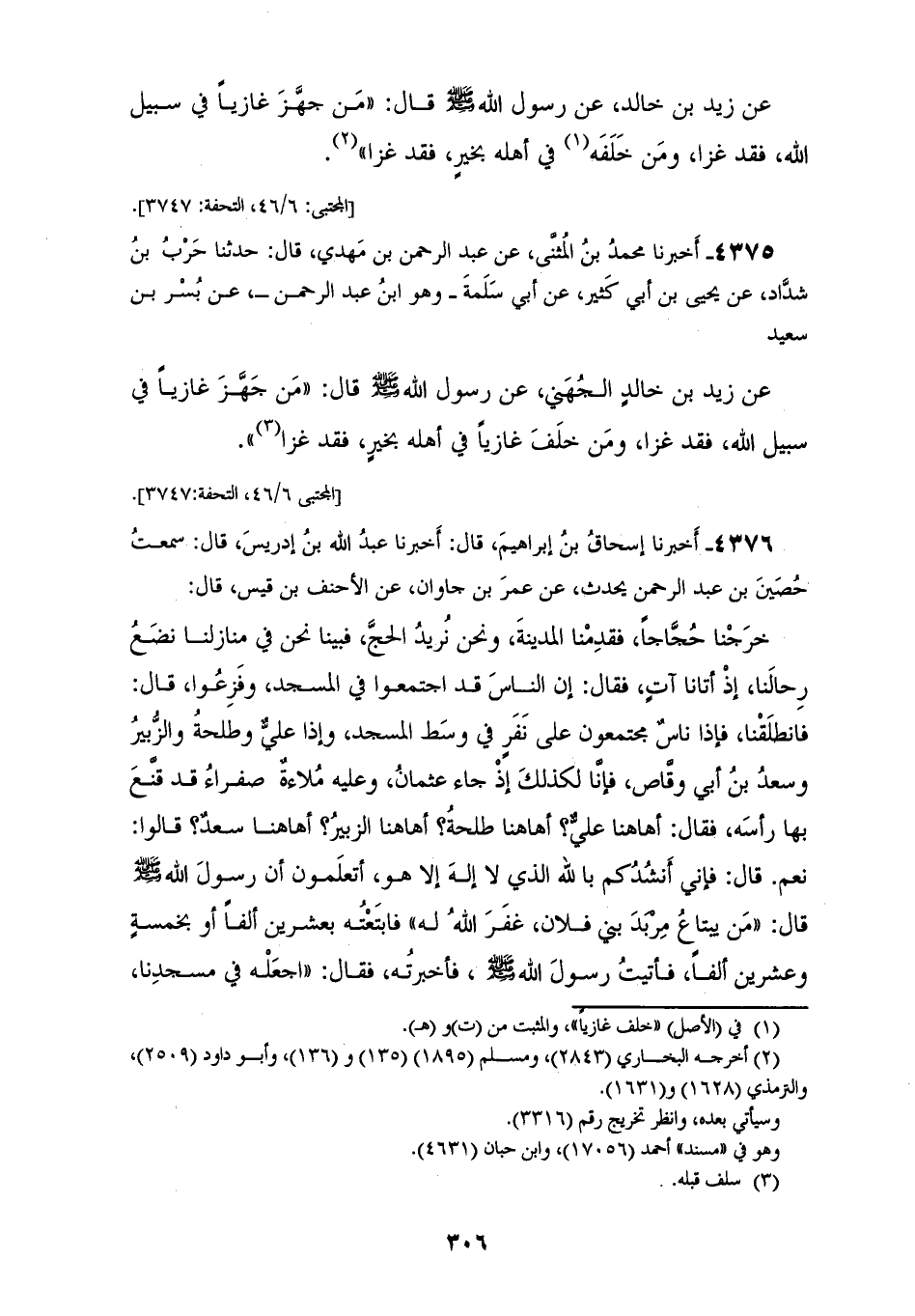 4375 - أَخْبَرَنَا مُحَمَّدُ بْنُ الْمُثَنَّى، عَنْ عَبْدِ الرَّحْمَنِ بْنِ مَهْدِيٍّ قَالَ: حَدَّثَنَا حَرْبُ بْنُ شَدَّادٍ، عَنْ يَحْيَى بْنِ أَبِي كَثِيرٍ، عَنْ أَبِي سَلَمَةَ وَهُوَ ابْنُ عَبْدِ الرَّحْمَنِ، عَنْ بُسْرِ بْنِ سَعِيدٍ، عَنْ زَيْدِ بْنِ خَالِدٍ الْجُهَنِيِّ عَنْ رَسُولِ اللهِ صَلَّى اللهُ عَلَيْهِ وَسَلَّمَ قَالَ: «§مَنْ جَهَّزَ غَازِيًا فِي سَبِيلِ اللهِ فَقَدْ غَزَا، وَمَنْ خَلَّفَ غَازِيًا فِي أَهْلِهِ بِخَيْرٍ فَقَدْ غَزَا»