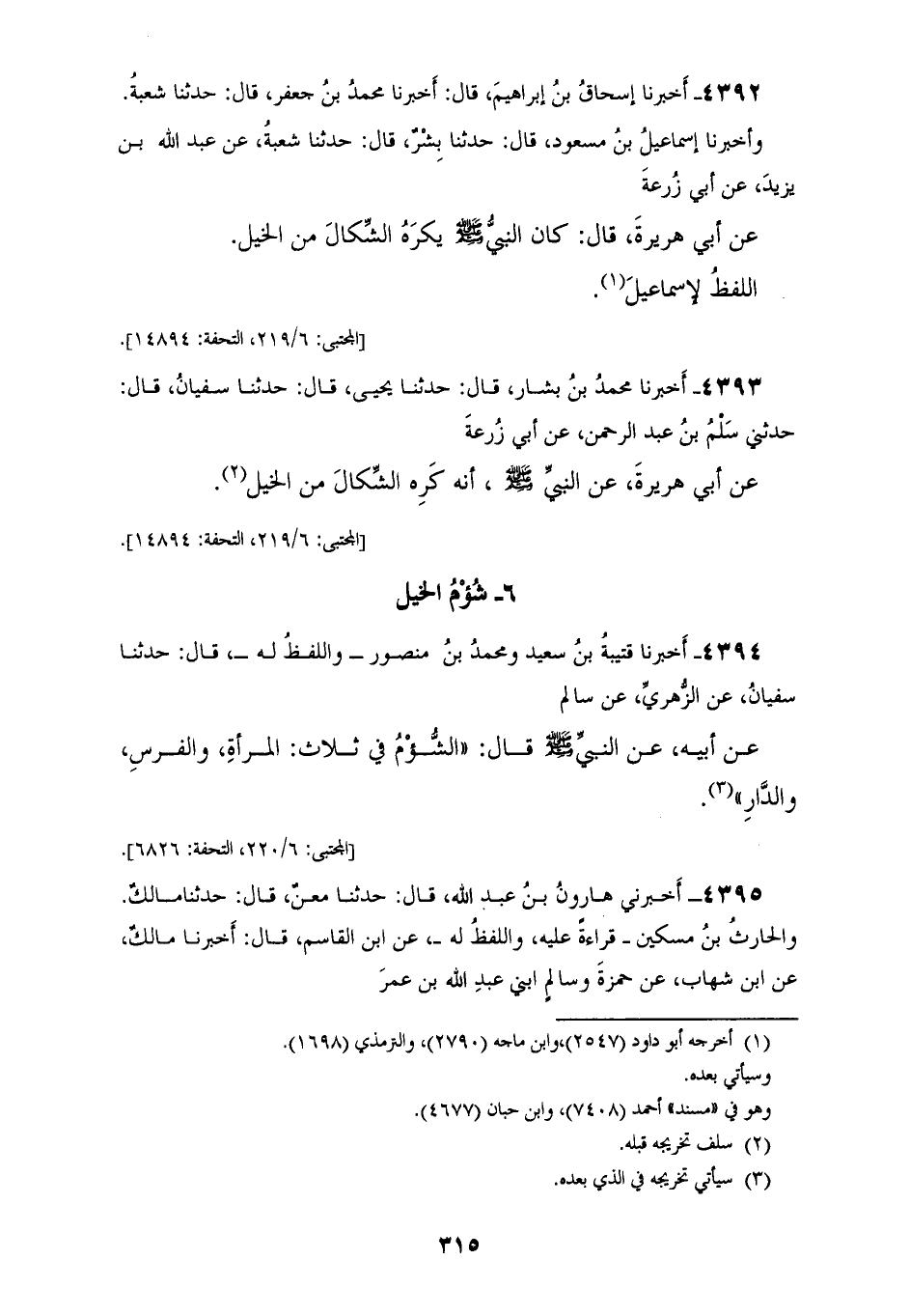4393 - أَخْبَرَنَا مُحَمَّدُ بْنُ بَشَّارٍ قَالَ: حَدَّثَنَا يَحْيَى قَالَ: حَدَّثَنَا سُفْيَانُ قَالَ: حَدَّثَنِي سَلْمُ بْنُ عَبْدِ الرَّحْمَنِ، عَنْ أَبِي زُرْعَةَ، عَنْ أَبِي هُرَيْرَةَ، عَنِ النَّبِيِّ صَلَّى اللهُ عَلَيْهِ وَسَلَّمَ أَنَّهُ «§كَرِهَ الشِّكَالَ مِنَ الْخَيْلِ»