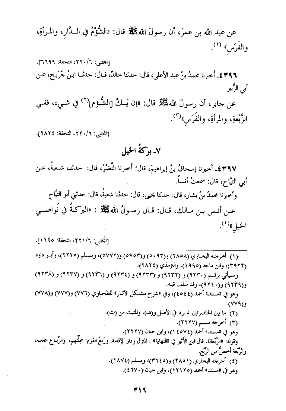 4397 - أَخْبَرَنَا إِسْحَاقُ بْنُ إِبْرَاهِيمَ قَالَ: أَخْبَرَنَا النَّضْرُ قَالَ: حَدَّثَنَا شُعْبَةُ، عَنْ أَبِي التَّيَّاحِ، قَالَ: سَمِعْتُ أَنَسًا، وَأَخْبَرَنَا وَمُحَمَّدَ بْنَ بَشَّارٍ، قَالَ: حَدَّثَنَا يَحْيَى، قَالَ: حَدَّثَنَا شُعْبَةُ، قَالَ: حَدَّثَنِي أَبُو التَّيَّاحِ، عَنْ أَنَسِ بْنِ مَالِكٍ، قَالَ: قَالَ رَسُولُ اللهِ صَلَّى اللهُ عَلَيْهِ وَسَلَّمَ: «§الْبَرَكَةُ فِي نَوَاصِي الْخَيْلِ»