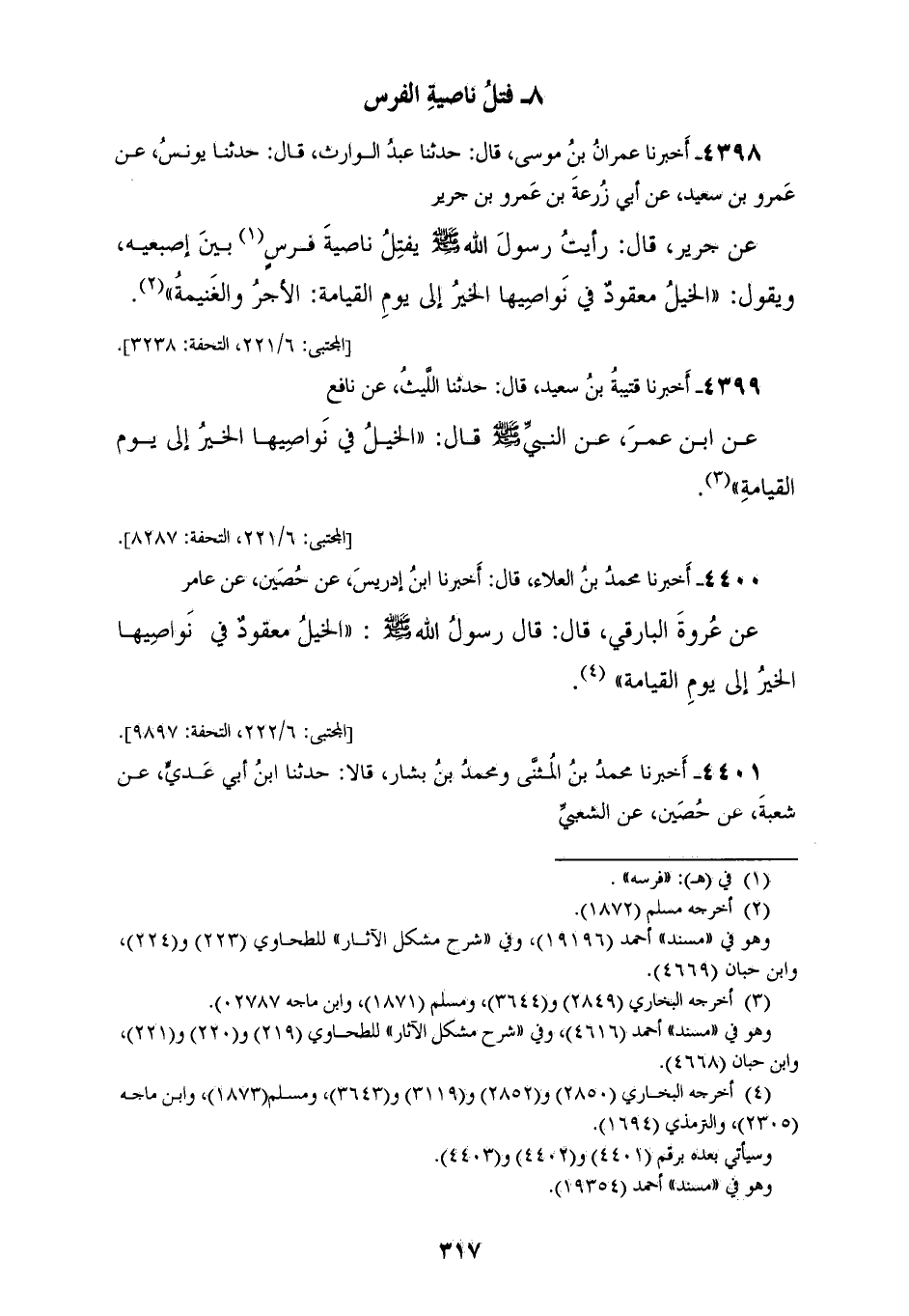 4398 - أَخْبَرَنَا عِمْرَانُ بْنُ مُوسَى، قَالَ: حَدَّثَنَا عَبْدُ الْوَارِثِ قَالَ: حَدَّثَنَا يُونُسُ، عَنْ عَمْرِو بْنِ سَعِيدٍ، عَنْ أَبِي زُرْعَةَ بْنِ عَمْرِو بْنِ جَرِيرٍ، عَنْ جَرِيرٍ قَالَ: رَأَيْتُ رَسُولَ اللهِ صَلَّى اللهُ عَلَيْهِ وَسَلَّمَ يَفْتِلُ نَاصِيَةَ فَرَسٍ بَيْنَ إِصْبُعَيْهِ وَيَقُولُ: «§الْخَيْلُ مَعْقُودٌ فِي نَوَاصِيهَا الْخَيْرُ إِلَى يَوْمِ الْقِيَامَةِ الْأَجْرُ وَالْغَنِيمَةُ»