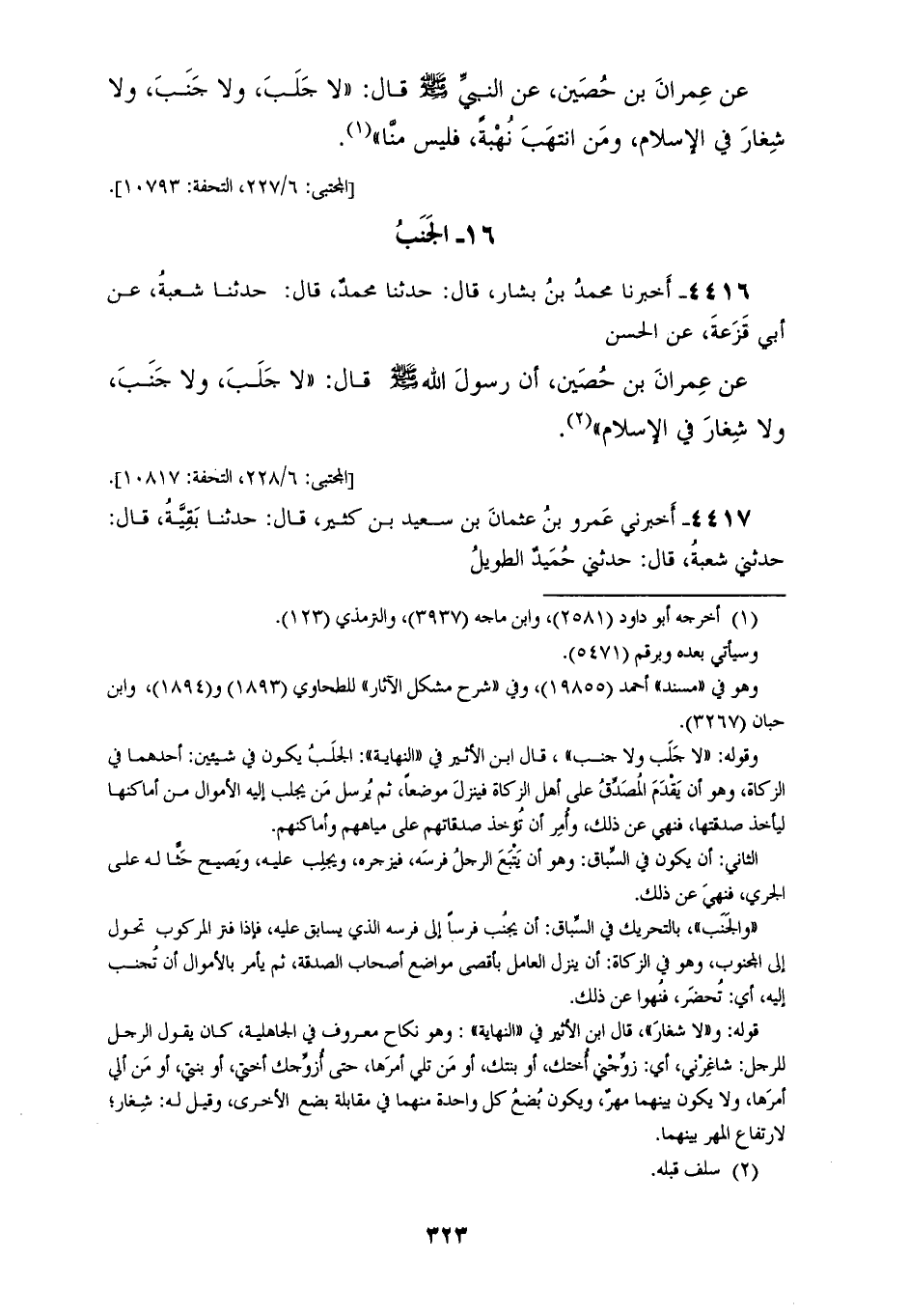 4415 - أَخْبَرَنَا مُحَمَّدُ بْنُ عَبْدِ اللهِ بْنِ بَزِيعٍ قَالَ: حَدَّثَنَا يَزِيدُ وَهُوَ ابْنُ زُرَيْعٍ قَالَ: حَدَّثَنَا حُمَيْدٌ قَالَ: حَدَّثَنَا الْحَسَنُ، عَنْ عِمْرَانَ بْنِ حَصِينٍ، عَنِ النَّبِيِّ صَلَّى اللهُ عَلَيْهِ وَسَلَّمَ قَالَ: «§لَا جَلَبَ، وَلَا جَنَبَ، وَلَا شِغَارَ فِي الْإِسْلَامِ، وَمَنِ انْتَهَبَ نُهْبَةً فَلَيْسَ مِنَّا»