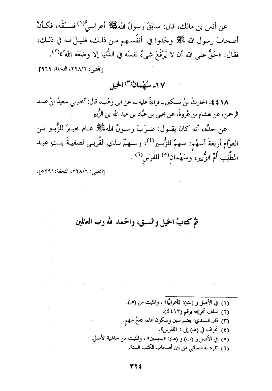 4418 - الْحَارِثُ بْنُ مِسْكِينٍ قِرَاءَةً عَلَيْهِ عَنِ ابْنِ وَهْبٍ قَالَ: أَخْبَرَنِي سَعِيدُ بْنُ عَبْدِ الرَّحْمَنِ، عَنْ هِشَامِ بْنِ عُرْوَةَ، عَنْ يَحْيَى بْنِ عَبَّادِ بْنِ عَبْدِ اللهِ بْنِ الزُّبَيْرِ، عَنْ جَدِّهِ، أَنَّهُ كَانَ يَقُولُ: «§ضَرَبَ رَسُولُ اللهِ صَلَّى اللهُ عَلَيْهِ وَسَلَّمَ عَامَ خَيْبَرَ لِلزُّبَيْرِ بْنِ الْعَوَّامِ أَرْبَعَةَ أَسْهُمٍ سَهْمٌ لِلزُّبَيْرِ، وَسَهْمٌ لِذِي الْقُرْبَى لِصَفِيَّةَ بِنْتِ عَبْدِ الْمُطَّلِبِ أُمِّ الزُّبَيْرِ، وَسَهْمَانِ لِلْفَرَسِ»