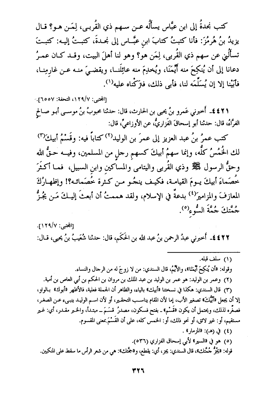 4421 - عَمْرُو بْنُ يَحْيَى بْنِ الْحَارِثِ قَالَ: حَدَّثَنَا مَحْبُوبٌ قَالَ: حَدَّثَنَا أَبُو إِسْحَاقَ، عَنِ الْأَوْزَاعِيِّ قَالَ: " §كَتَبَ عُمَرُ بْنُ عَبْدِ الْعَزِيزِ إِلَى عُمَرَ بْنِ الْوَلِيدِ كِتَابًا فِيهِ: وَقَسَمَ أَبُوكَ لَكَ الْخُمُسَ كُلَّهُ، وَإِنَّمَا سَهْمُ أَبِيكَ كَسَهْمِ رَجُلٍ مِنَ الْمُسْلِمِينَ، وَفِيهِ حَقُّ اللهِ، وَحَقُّ الرَّسُولِ، وَذِي الْقُرْبَى، وَالْيَتَامَى، وَالْمَسَاكِينِ، وَابْنِ السَّبِيلِ، فَمَا أَكْثَرَ خُصَمَاءِ ابْنِكَ يَوْمَ الْقِيَامَةِ، فَكَيْفَ يَنْجُو مَنْ كَثُرَتْ خُصَمَاؤُهُ، وَإِظْهَارُكَ الْمَعَازِفَ وَالْمَزَامِيرَ بِدْعَةٌ فِي الْإِسْلَامِ، وَلَقَدْ هَمَمْتُ أَنْ أَبْعَثَ إِلَيْكَ مَنْ يَجُزُّ جُمَّتَكَ جُمَّةَ السَّوْءِ "