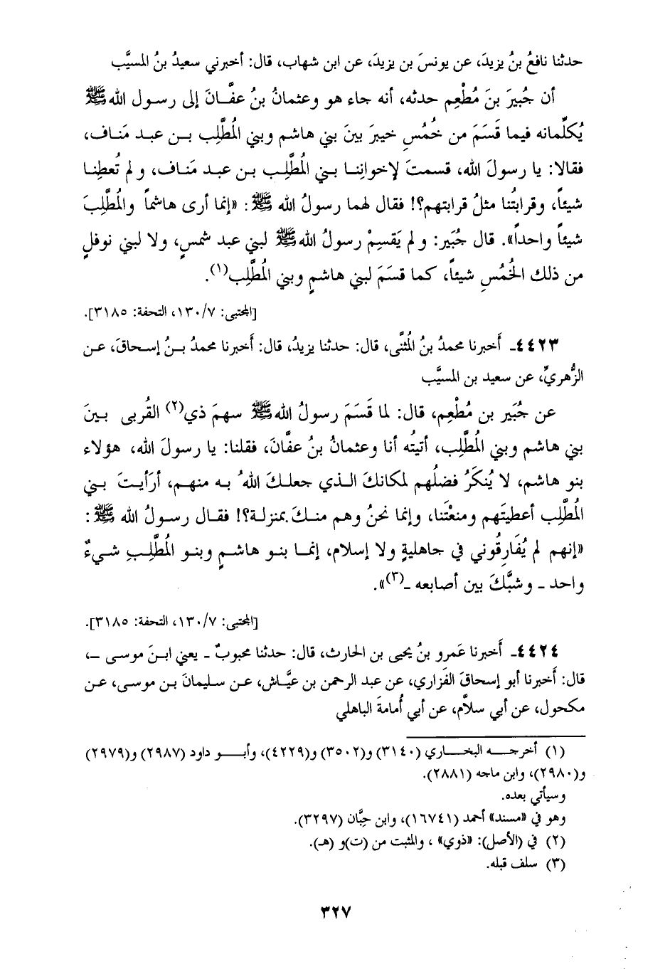 4423 - أَخْبَرَنَا مُحَمَّدُ بْنُ الْمُثَنَّى قَالَ: حَدَّثَنَا يَزِيدُ قَالَ: أَخْبَرَنَا مُحَمَّدُ بْنُ إِسْحَاقَ، عَنِ الزُّهْرِيِّ، عَنْ سَعِيدِ بْنِ الْمُسَيِّبِ، عَنْ جُبَيْرِ بْنِ مُطْعِمٍ قَالَ: لَمَّا قَسَمَ رَسُولُ اللهِ صَلَّى اللهُ عَلَيْهِ وَسَلَّمَ سَهْمَ ذِي الْقُرْبَى بَيْنَ بَنِي هَاشِمٍ وَبَنِي الْمُطَّلِبِ أَتَيْتُهُ أَنَا وَعُثْمَانُ بْنُ عَفَّانَ فَقُلْنَا يَا رَسُولَ اللهِ هَؤُلَاءِ بَنُو هَاشِمٍ لَا يُنْكَرُ فَضْلُهُمْ لِمَكَانِكَ الَّذِي جَعَلَكَ اللهُ بِهِ مِنْهُمْ أَرَأَيْتَ بَنِي الْمُطَّلِبِ أَعْطَيْتَهُمْ وَمَنَعْتَنَا وَإِنَّمَا نَحْنُ وَهُمْ مِنْكَ بِمَنْزِلَةٍ فَقَالَ رَسُولُ اللهِ صَلَّى اللهُ عَلَيْهِ وَسَلَّمَ: «إِنَّهُمْ §لَمْ يُفَارِقُونِي فِي جَاهِلِيَّةٍ، وَلَا إِسْلَامٍ إِنَّمَا بَنُو هَاشِمٍ وَبَنُو الْمُطَّلِبِ شَيْءٌ وَاحِدٌ وَشَبَّكَ بَيْنَ أَصَابِعِهِ»