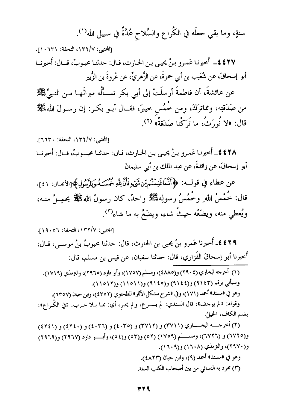 4427 - أَخْبَرَنَا عَمْرُو بْنُ يَحْيَى بْنِ الْحَارِثِ قَالَ: حَدَّثَنَا مَحْبُوبٌ قَالَ: أَخْبَرَنَا أَبُو إِسْحَاقَ، عَنْ شُعَيْبِ بْنِ أَبِي حَمْزَةَ، عَنِ الزُّهْرِيِّ، عَنْ عُرْوَةَ بْنِ الزُّبَيْرِ، عَنْ عَائِشَةَ، أَنَّ فَاطِمَةَ، أَرْسَلَتْ إِلَى أَبِي بَكْرٍ تَسْأَلُهُ مِيرَاثَهَا مِنَ النَّبِيِّ صَلَّى اللهُ عَلَيْهِ وَسَلَّمَ مِنْ صَدَقَتِهِ وَمِمَّا تَرَكَ وَمِنْ خُمُسِ خَيْبَرَ، فَقَالَ أَبُو بَكْرٍ: إِنَّ رَسُولَ اللهِ صَلَّى اللهُ عَلَيْهِ وَسَلَّمَ قَالَ: «§لَا نُورَثُ مَا تَرَكْنَا صَدَقَةٌ»