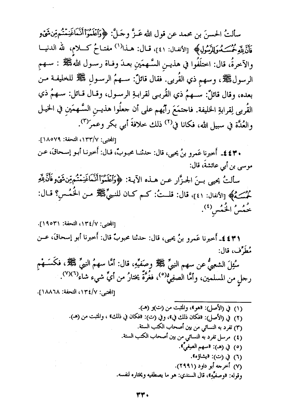 4431 - أَخْبَرَنَا عَمْرُو بْنُ يَحْيَى قَالَ: حَدَّثَنَا مَحْبُوبٌ قَالَ: أَخْبَرَنَا أَبُو إِسْحَاقَ، عَنْ مُطَرِّفٍ قَالَ: سُئِلَ الشَّعْبِيُّ عَنْ سَهْمِ النَّبِيِّ صَلَّى اللهُ عَلَيْهِ وَسَلَّمَ وَصَفِيِّهِ قَالَ: «§أَمَّا سَهْمُ النَّبِيِّ صَلَّى اللهُ عَلَيْهِ وَسَلَّمَ، فَكَسَهْمِ رَجُلٍ مِنَ الْمُسْلِمِينَ، وَأَمَّا الصَّفِيُّ، فَغُرَّةٌ يَخْتَارُ مِنْ أَيِّ شَيْءٍ شَاءَ»