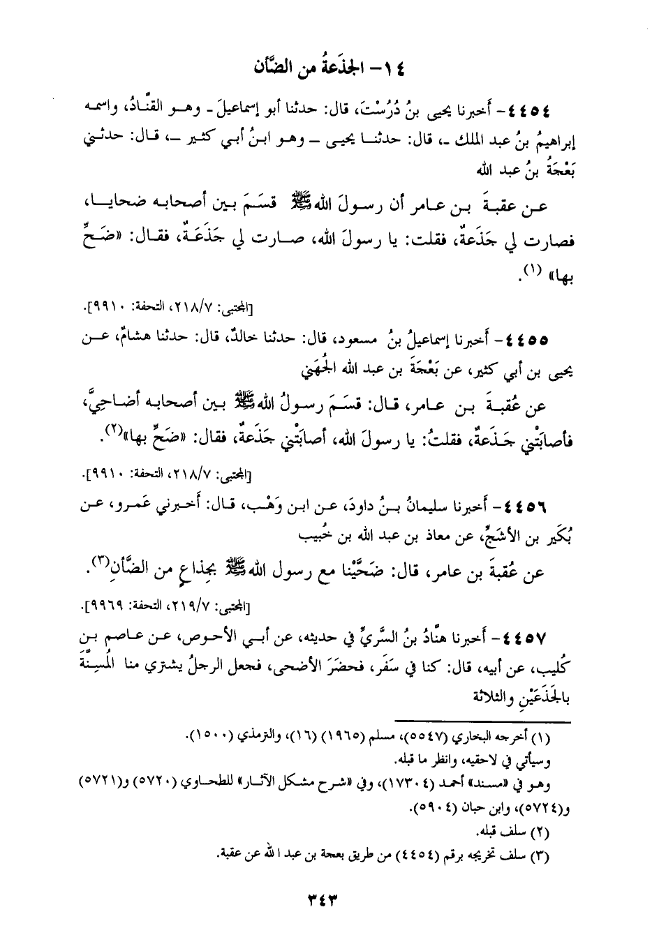 4455 - أَخْبَرَنَا إِسْمَاعِيلُ بْنُ مَسْعُودٍ، قَالَ: حَدَّثَنَا خَالِدٌ قَالَ: حَدَّثَنَا هِشَامٌ، عَنْ يَحْيَى بْنِ أَبِي كَثِيرٍ، عَنْ بَعْجَةَ بْنِ عَبْدِ اللهِ الْجُهَنِيِّ، عَنْ عُقْبَةَ بْنِ عَامِرٍ قَالَ: قَسَمَ رَسُولُ اللهِ صَلَّى اللهُ عَلَيْهِ وَسَلَّمَ بَيْنَ أَصْحَابِهِ أَضَاحِيَّ فَأَصَابَتْنِي جَذَعَةٌ فَقُلْتُ: يَا رَسُولَ اللهِ §أَصَابَتْنِي جَذَعَةٌ فَقَالَ: «ضَحِّ بِهَا»
