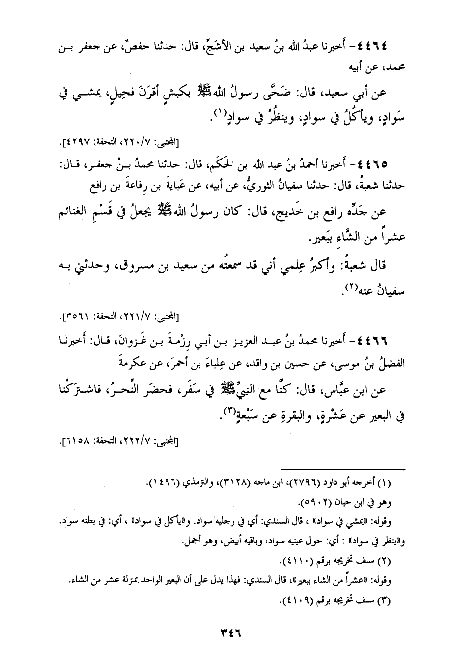 4464 - أَخْبَرَنَا عَبْدُ اللهِ بْنُ سَعِيدِ بْنِ الْأَشَجُّ قَالَ: حَدَّثَنَا حَفْصٌ، عَنْ جَعْفَرِ بْنِ مُحَمَّدٍ، عَنْ أَبِيهِ، عَنْ أَبِي سَعِيدٍ قَالَ: «§ضَحَّى رَسُولُ اللهِ صَلَّى اللهُ عَلَيْهِ وَسَلَّمَ بِكَبْشٍ أَقْرَنَ فَحِيلٍ يَمْشِي فِي سَوَادٍ، وَيَأْكُلُ فِي سَوَادٍ، وَيَنْظُرُ فِي سَوَادٍ»