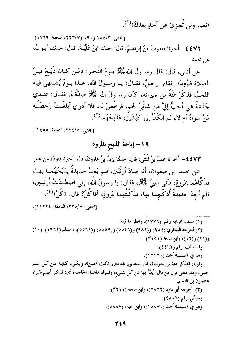 4472 - أَخْبَرَنَا يَعْقُوبُ بْنُ إِبْرَاهِيمَ قَالَ: حَدَّثَنَا ابْنُ عُلَيَّةَ قَالَ: حَدَّثَنَا أَيُّوبُ، عَنْ مُحَمَّدٍ، عَنْ أَنَسٍ قَالَ: قَالَ رَسُولُ اللهِ صَلَّى اللهُ عَلَيْهِ وَسَلَّمَ يَوْمَ النَّحْرِ: «§مَنْ كَانَ ذَبَحَ قَبْلَ الصَّلَاةِ»، فَلْيُعِدْ فَقَامَ رَجُلٌ فَقَالَ: يَا رَسُولَ اللهِ هَذَا يَوْمٌ يُشْتَهَى فِيهِ اللَّحْمُ فَذَكَرَ هَنَةً مِنْ جِيرَانِهِ كَأَنَّ رَسُولَ اللهِ صَلَّى اللهُ عَلَيْهِ وَسَلَّمَ صَدَّقَهُ فَقَالَ: عِنْدِي جَذَعَةٌ هِيَ أَحَبُّ إِلَيَّ مِنْ شَاتَيْ لَحْمٍ، «فَرَخَّصَ لَهُ» فَلَا أَدْرِي أَبَلَغَتْ رُخْصَتُهُ مَنْ سِوَاهُ أَمْ لَا ثُمَّ انْكَفَأَ إِلَى كَبْشَيْنِ فَذَبَحَهُمَا