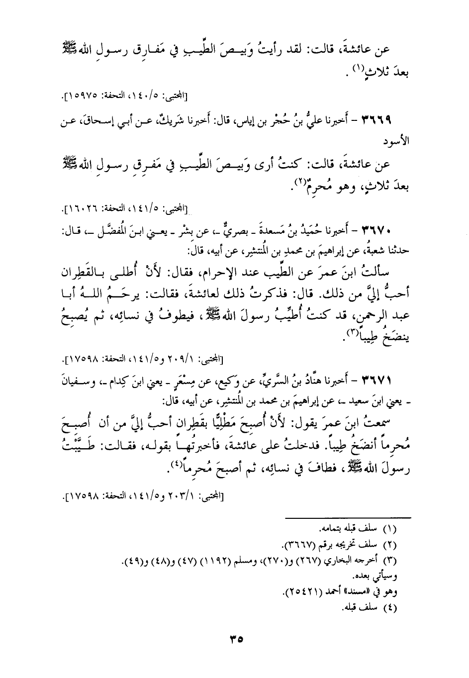 3669 - أَخْبَرَنَا عَلِيُّ بْنُ حُجْرِ بْنِ إِيَاسٍ قَالَ: أَخْبَرَنَا شَرِيكٌ، عَنْ أَبِي إِسْحَاقَ، عَنِ الْأَسْوَدِ، عَنْ عَائِشَةَ، قَالَتْ: «§كُنْتُ أَرَى وَبِيصَ الطِّيبِ فِي مَفْرِقِ رَسُولِ اللهِ صَلَّى اللهُ عَلَيْهِ وَسَلَّمَ بَعْدَ ثَلَاثٍ وَهُوَ مُحْرِمٌ»